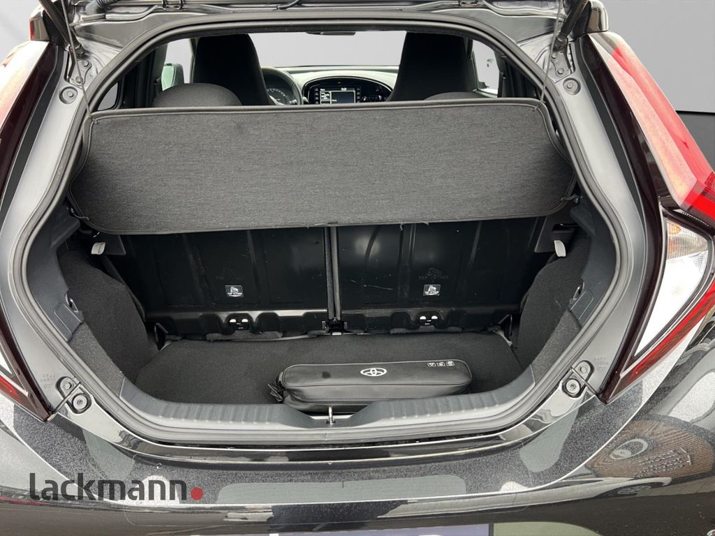 - Weiteres: Reifendruck-Kontrollsystem, Reifen-Reparaturkit, Schadstoffarm nach Abgasnorm Euro 6d, Innenraumfilter: Staub- und Pollenfilter mit Aktivkohlefilter, LM-Felgen, Schutzfolie Türgriffmulde, Audiosystem: Multimedia Toyota Touch, Lenkrad (Leder) mit Multifunktion, Rücksitz klappbar, Toyota Safety Sense, Zentralverriegelung mit Fernbedienung, Scheibenwischer mit Regensensor, Scheinwerfer LED, Airbag Fahrer-/Beifahrerseite, Anti-Blockier-System (ABS), Nebelscheinwerfer, Stoßfänger Wagenfarbe, Tagfahrlicht LED, Fensterheber elektrisch vorn, Lenksäule (Lenkrad) höhenverstellbar, Seitenairbag vorn, Außenspiegel elektr. verstell- und heizbar, Kopf-Airbag-System, USB-Schnittstelle, Getriebe 5-Gang, Zentralverriegelung, Gepäckraumabdeckung / Rollo, Rücksitz geteilt, Park-Assistent mit Rückfahrkamera, 2-Farben-Lackierung Metallic, 3-Speichen Lenkrad, Audiobedienung am Lenkrad, Autom. Begleitfunktion der Beleuchtung (Follow me home), Bluetooth-Schnittstelle, DAB-Tuner (Radioempfang digital), Dach in Kontrastfarbe, Design-Paket, Eco-Anzeige für verbrauchsoptimiertes Fahren, Einparkhilfe vorn und hinten, ESP mit Schlupfregelung (VSC mit TRC), Fernlichtassistent (Abblendautomatik Fahrlicht, AHB), Freisprechanlage Bluetooth, Geschwindigkeits-Begrenzeranlage, Gurtwarner hinten, Isofix-Aufnahmen für Kindersitz, Kindersicherung, Klimaautomatik 2-Zonen, Komfort-Paket, Kopfstützen hinten, Lederlenkrad, Mica-Lackierung, Motor 1,0 Ltr. - 53 kW KAT, Müdigkeitserkennungs-Sensor, Multimedia Display (9,0 Zoll), Pre-Collision-System (PCS), Servolenkung elektrisch, Sicherheitssystem Toyota Connect mit automatischem Notruf (eCall), Sicht-Paket, Sitzheizung vorn, Sitzhöhenverstellung Fahrersitz, Smartphone-Integration x-connect (Apple CarPlay und Android Auto), Spiegel schwarz lackiert, Spurhalteassistent, Startanlage Smart-Key, Entry & Drive, Stop&Go-System (TSGS), Türgriffe lackiert, Verglasung hinten abgedunkelt, Verkehrszeichenerkennung (RSA), Warnanlage für Sicherheitsgurte vorn