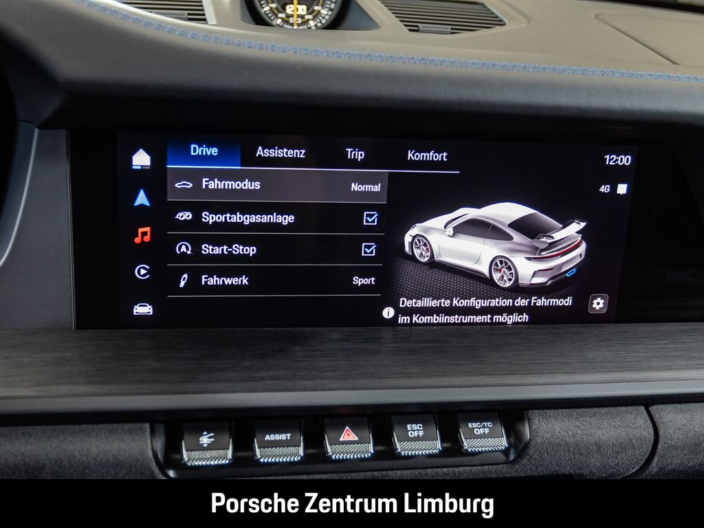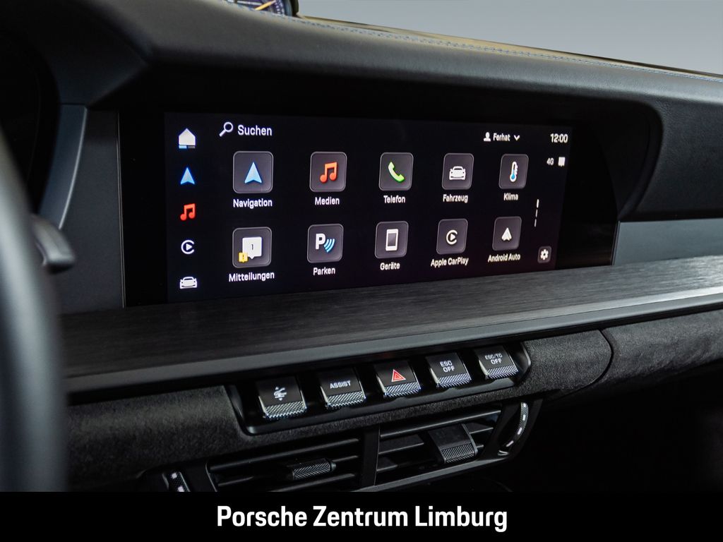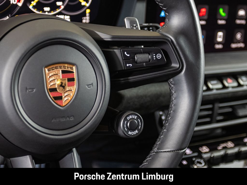 - Weiteres: (2W6) Exclusive Design Tankdeckel, (2JG) Airblades im Bugteil lackiert in Exterieurfarbe, (2UH) Liftsystem Vorderachse, (8LT) Chrono Paket mit Porsche Design GT Uhr, (1LR) Bremssättel lackiert in Schwarz (hochglanz), (0I4) 90 Liter Kraftstofftank, (1NX) Räder lackiert in Schwarz (seidenglanz), (1G8) Reifenreparaturset, (Q1J) Adaptive Sportsitze Plus (18-Wege, elektrisch), (ALS) Sitzkonsolen Leder mit farbigen Ziernähten - sharkblue, (4A3) Sitzheizung vorn, (5TH) Interieur-Paket Aluminium gebürstet in Schwarz, (1MI) GT-Sportlenkrad in Glattleder schwarz, (3B3) ISOFIX-Befestigungssystem, (2C6) Verkleidung Lenksäule Leder, (BHV) Erweiterungspaket Leder mit farbigen Ziernähten - sharkblue, (FX8) Sicherheitsgurte sharkblue, (VT9) Türeinstiegsblenden Aluminium gebürstet in Schwarz, beleuchtet, (P19) Pedalerie und Fußstütze Aluminium, (5XH) Sonnenblenden Leder, (6E4) „PORSCHE“ Schriftzug auf Deckel Ablagefach Race-Tex, (QE3) Ablagenetz Beifahrerfußraum, (9VL) BOSE® Surround Sound-System, (8JU) HD-Matrix LED-Hauptscheinwerfer abgedunkelt, (8VH) Exclusive Design Heckleuchten, (UD1) LED-Türprojektoren mit „BORN IN FLACHT“ Logo, (VW7) Privacy-Verglasung, (7X1) ParkAssistent hinten, (2V4) Ionisator, (VC2) Garagentoröffner nach HomeLink® Standard, (QK3) Vorrüstung Porsche Dashcam, (QQ2) Licht-Design-Paket