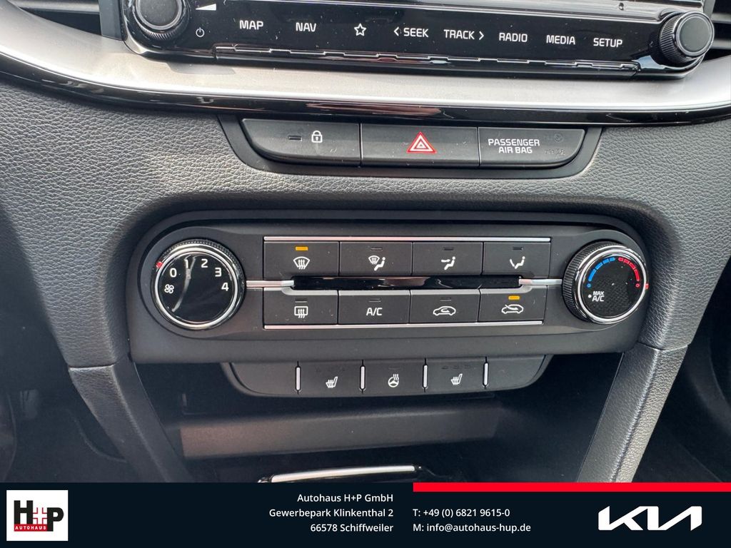 - Weiteres: BORDCOMPUTER, Klimaanlage, Reifendruck-Kontrollsystem, Geschwindigkeits-Regelanlage (Tempomat), Schalt-/Wählhebelgriff Leder, Rückfahrkamera, Reifen-Reparaturset, Einparkhilfe hinten, Lenkrad mit Multifunktion, Heckleuchten LED, Dachspoiler, Getriebe 7-Gang - Doppelkupplungsgetriebe DCT, Fensterheber elektr. mit Einklemmschutz vorn, Rücksitz klappbar 1/3-2/3, Fensterheber elektr. mit Einklemmschutz hinten, LM-Felgen, Sonderlackierung Carrara-Weiß, Schadstoffarm nach Abgasnorm Euro 6d, Audio-Navigationssystem KIA (10,25), Airbag Fahrer-/Beifahrerseite, Anti-Blockier-System (ABS), Nebelscheinwerfer, Stoßfänger Wagenfarbe, Tagfahrlicht LED, Außenspiegel elektr. verstellbar, beide, Wegfahrsperre, Kopf-Airbag-System, Seitenairbag, USB-Anschluss + AUX-IN-Anschluss, Elektron. Stabilitäts-Programm (ESP / ESC), USB-Schnellladeanschluß Mittelkonsole, Tagfahrlicht LED hinten, 12V-Steckdose, Abbiegelicht, aktiver Spurhalteassistent (LKAS, Lane Keep Assist System), Antriebsart: Frontantrieb, Antriebs-Schlupfregelung (TCS), Außenspiegel Wagenfarbe, Berg-Anfahr-Assistent, Bi-LED-Scheinwerfer, Bremsassistent, Chromeinfassung Seitenfenster, Dachantenne im Haifischflossen-Design, Drive-Mode Auswahl, Einschaltautomatik für Fahrlicht, Fensterheber elektrisch vorn und hinten, Fernlichtassistent, Freisprechanlage Bluetooth, Frontkollisionswarnung, Getränkehalter, Gurtwarner, Gurtwarner hinten, Heckscheibe heizbar, Isofix-Aufnahmen für Kindersitz, Kopfstützen hinten, Laderaumboden variabel, Lederlenkrad, Lenkrad heizbar, Mittelarmlehne vorn verschiebbar, Müdigkeitserkennungs-Sensor (Driver Attention Warning, DAW), Parkbremse elektrisch, Polster: Stoff/Leder, Servolenkung elektronisch, Sitzheizung vorn, Sitzhöhenverstellung Fahrersitz, Smartphone Schnittstelle, Türgriffe innen Chrom-Optik, Türgriffe lackiert, Verkehrszeichenerkennung, Wärmeschutzverglasung, ZV mit Fernbedienung