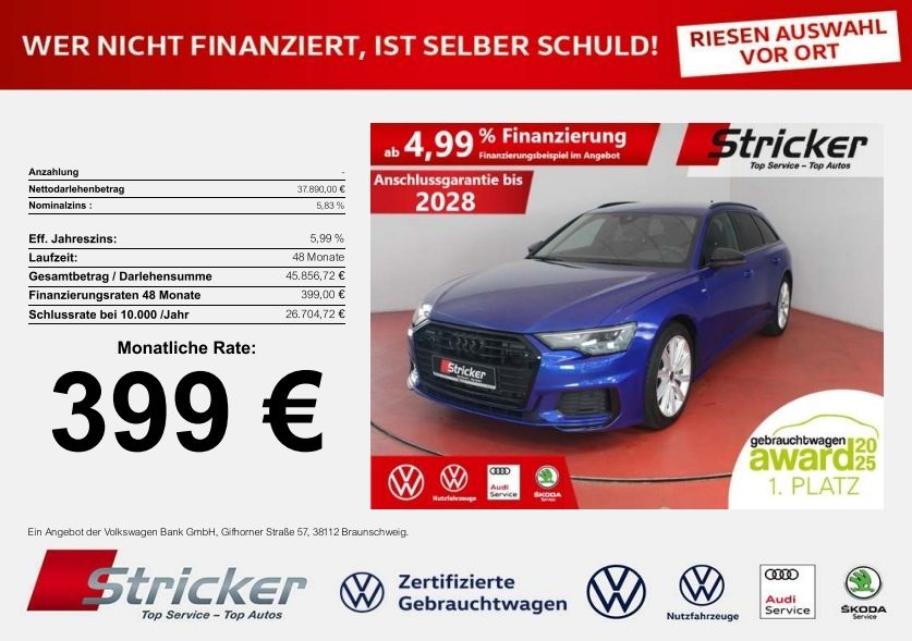 Scheckheftgepflegt; Komfortklimaautomatik 4-Zonen; LED-Heckleuchten; LED-Scheinwerfer; Sitzheizung vorn; Rückfahrkamera; S line Exterieurpaket; Ambiente-Lichtpaket; MMI Navigation plus mit MMI touch response; Adaptiver Fahrassistent mit Notfallassistent; Adaptiver Geschwindigkeitsassistent mit Geschwindigkeitsbegrenzer, Effizienz-, Ausweich- und Abbiegeassistent; Top-Infotainment Premium (MIB3); Komfortmittelarmlehne vorn; Memory-Funktion für den Fahrersitz; Audi Soundsystem; Lederlenkrad 3-Speichen mit Multifunktion und Schaltwippen; Leichtmetallfelgen; 4-Wege-Lendenwirbelstütze für die Vordersitze; Komfortschlüssel mit sensorgesteuerter Gepäckraumentriegelung; Außenspiegel elektrisch einstell-, beheiz- und anklappbar, beidseitig automatisch abblendend, mit Memory-Funktion; Smartphone-Interface; Sportsitze vorn; Anhängerkupplung schwenkbar; Gepäckraumklappe, elektrisch öffnend und schließend; Head-Up Display; Dynamiklenkung; Dynamik-Allradlenkung; Details zur Finanzierung unten im Inserat! Sie möchten eine Anzahlung leisten, Ihr altes Fahrzeug eintauschen oder haben eine abweichende jährliche Fahrleistung? Alles kein Problem, wir machen Ihnen gerne ein Angebot!