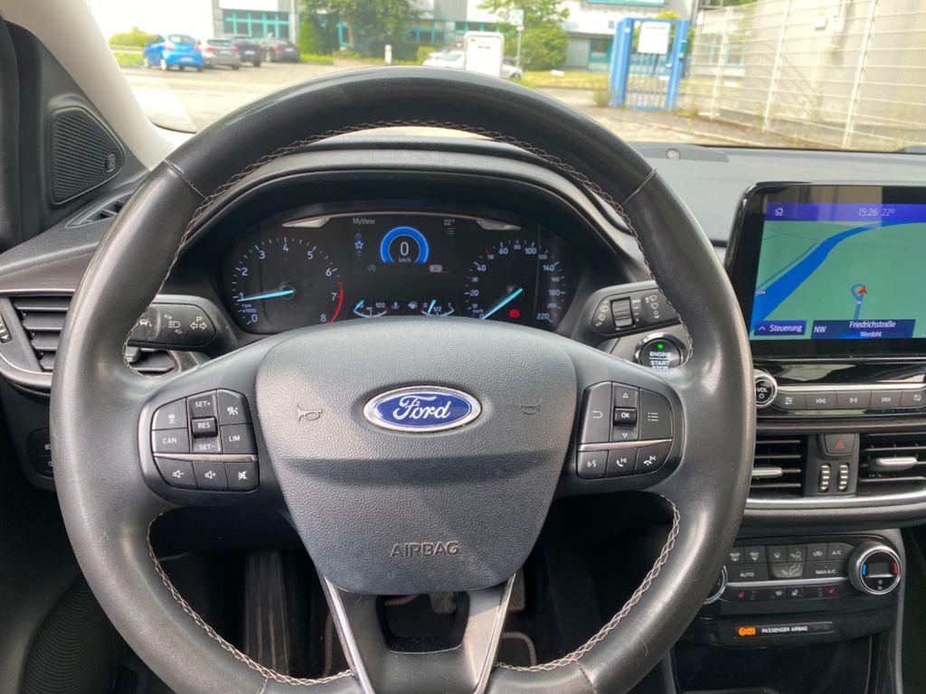 Ambiente-Beleuchtung vorn (LED), Antischlupfregelung (ASR), Audio-Navigationssystem Ford mit AppLink, Außenspiegel elektr. anklappbar, Außenspiegel elektr. verstell- und heizbar, Bordcomputer, Dachhimmel Stoff, Eco-Anzeige für verbrauchsoptimiertes Fahren (EcoCoach), Einparkhilfe hinten, Fahrassistenz-System: Berganfahr-Assistent (Hill-Holder), Fahrassistenz-System: Falschfahrer-Warnfunktion, Fahrassistenz-System: Fernlichtassistent (Scheinwerfer mit Abblendautomatik), Fahrassistenz-System: Notbrems-Assistent, Fahrassistenz-System: Post-Collision-System, Fahrassistenz-System: Pre-Collision-System, Fahrassistenz-System: Spurhalteassistent mit Müdigkeitserkennungs-Sensor, Fahrassistenz-System: Verkehrsschildassistent, Fensterheber elektrisch vorn + hinten mit Komfortschließung, FordPass Connect inkl. eCall, Fußmatten Teppich, Getriebe 6-Gang - Typ: 6MX65, Heckleuchten LED, Induktionsladeschale für mobile Endgeräte, Innenraumfilter: Staub- und Pollenfilter, Intelligent Protection System (IPS), Intelligenter Geschwindigkeits-Begrenzer, Isofix-Aufnahmen für Kindersitz, Karosserie: 5-türig, Komfort-Paket, Kopfstützen hinten mechan. verstellbar (3 Stück), Laderaumboden variabel (Ford Megabox), Lendenwirbelstütze Sitz vorn links, Lenksäule (Lenkrad) höhen-/längsverstellbar, LM-Felgen, Motor 1,0 Ltr. - 92 kW EcoBoost KAT, My Key (2. Fahrzeugschlüssel programmierbar), Nebelscheinwerfer LED, Otto-Partikelfilter (OPF), Radstand 2588 mm, Reifen-Reparaturkit, Reifendruck-Kontrollsystem, Rücksitzlehne geteilt/klappbar (60:40), Schadstoffarm nach Abgasnorm Euro 6d-TEMP, Scheinwerfer LED, Scheinwerfer-Assistent mit Tag-/Nachtsensor, Sitze vorn höhenverstellbar, Sitze vorn mit Massagefunktion, Sonnenblende links mit Spiegel (beleuchtet), Sonnenblende rechts mit Spiegel (beleuchtet), Sportsitze vorn, Start/Stop-Anlage, Türgriffe außen Wagenfarbe, Verglasung hinten abgedunkelt (Privacy Glass)