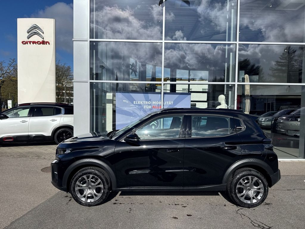 - Weiteres: Antriebs-Schlupfregelung (ASR), Klimaanlage, Reifendruck-Kontrollsystem, Sitzbezug / Polsterung: Stoff, Einparkhilfe hinten, Scheibenwischer mit Regensensor, Dachreling, Einschaltautomatik für Fahrlicht, Fahrmodusschalter, Mittelarmlehne vorn, Comfort Federung (Citroen Advanced), USB-Anschluss (Typ C), Geschwindigkeits-Regelanlage (Tempomat) inkl. Geschwindigkeits-Begrenzeranlage, Lenkrad (Spaltleder), Innenausstattung: Ambiente Urban Grey, Elektromotor 83 kW (cont. 53 kW), Head-up-Display (Kombiinstrument hochgesetzt), Sonderlackierung Perla-Nera-Schwarz Metallic, Reifen-Reparaturkit, Airbag Fahrer-/Beifahrerseite, Tagfahrlicht LED, Fensterheber elektrisch vorn, Seitenairbag vorn, Kopf-Airbag-System, Anti-Blockier-System (ABS), 12V-Steckdose, Akustischer Fußgängerschutz, Aufmerksamkeits-Assistent (Müdigkeitserkennungs-Sensor), Außenspiegel elektr. anklappbar, Beifahrerairbag abschaltbar, Berganfahrhilfe, Bremsassistent, Bremsenergierückgewinnung, Dach Wagenfarbe, Elektr. Bremskraftverteilung, Freisprechanlage Bluetooth, Gurtwarner, Innenspiegel abblendbar, Parkbremse elektrisch, Radioempfang Digital (DAB), Scheinwerfer Eco-LED, Smartphone Schnittstelle, Spurassistent (AFIL), Verkehrszeichenerkennung