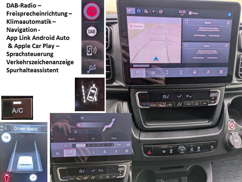 Airbag Beifahrerseite, Airbag Fahrerseite, Anhänger-Stabilisierungs-Programm, Antriebs-Schlupfregelung (ASR), Außenspiegel elektr. verstell- und heizbar, Außenspiegel lang, für Fahrzeugbreite 2200 mm, Black-Box (Event Data Recorder, EDR), Bremsassistent, Dachantenne, Eco-Paket, Einparkhilfe elektronisch, Fahrassistenz-System: Adaptive Lastkontrolle (LAC), Fahrassistenz-System: Berganfahr-Assistent, Fahrassistenz-System: Intelligenter Geschwindigkeits-Assistent, Fahrassistenz-System: Müdigkeits-Warner, Fahrassistenz-System: Notbrems-Assistent, Fahrassistenz-System: Post-Collision-System, Fahrassistenz-System: Seitenwind-Assistent, Fahrassistenz-System: Spurhalteassistent, Fahrassistenz-System: Spurhalteassistent inkl. Verkehrszeichenerkennung, Fahrassistenz-System: Überschlag-Schutzsystem, Generator 180 A, Geschwindigkeits-Regelanlage (Tempomat) inkl. Geschwindigkeits-Begrenzeranlage, Handschuhfach mit Kühlfunktion, Infotainment-System mit 5" Farbdisplay, DAB und Bluetooth-Schnittstelle, Karosserie/Aufbau: Kasten Hochraum Standard, Kraftstofftank: 90 Ltr., Kühlergrill schwarz, Laderaumtrennwand, Modellpflege (2), Motor 2,2 Ltr. - 103 kW Turbodiesel Multijet, Radstand 4035 mm, Reifen-Reparaturkit, Reifendruck-Kontrollsystem, Rückfahrwarner akustisch (Warnsignal außen), Schadstoffarm nach Abgasnorm Euro 6e, Scheinwerfer Halogen, Schiebetür Lade-/Fahrgastraum rechts, Sitzbezug / Polsterung: Stoff, Sitze im Fahrerhaus: Beifahrerdoppelsitz, Sitze im Fahrerhaus: Fahrersitz mit Armlehne und Lendenwirbelstütze, SMART Fahrtenschreiber (4.0), Start/Stop-Anlage Motor, Telekamera nach hinten, Telematik-System UConnect Box, Zul. Gesamtgewicht 3,50 t