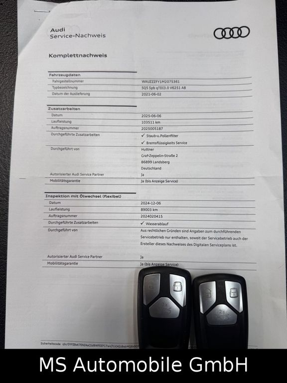 Airbag Fahrer-/Beifahrerseite, Allradkupplung, Audi connect (Notruf- und Assistance-System), Audi Drive Select, Dachhimmel Stoff, schwarz, Einstiegsleisten mit Aluminiumeinlage und Schriftzug, beleuchtet, Fahrassistenz-System: City-Notbremsfunktion (Audi pre sense City), Frontscheibe Akustikglas, Fußmatten Velours, Gepäckraum-Abtrennung (Netz), Gepäckraumklappe elektr. betätigt (öffnen + schliessen), Getränkehalter, Innenausstattung: Dekoreinlagen Akzentteile schwarz glänzend, Innenausstattung: Dekoreinlagen Aluminium Matt, Isofix-Aufnahmen für Kindersitz, Karosserie: 4-türig, Kopf-Airbag-System (Sideguard), Kraftstofftank: 70 Ltr., Ladekantenschutz (Edelstahl), Lendenwirbelstützen vorn, elektr. verstellbar, Lenkrad (Leder - 3-Speichen) mit Multifunktion plus und Schaltfunktion, Lenksäule (Lenkrad) mech. Höhen-/Längsverstellung, Luftzusatzheizung elektrisch, Mild-Hybrid 251 kW (Motor 3,0 Ltr. - 251 kW V6 24V TDI), Mild-Hybrid-Technologie, Multifunktionskamera, Nichtraucher-Paket, Parkbremse elektro-mechanisch, Pedale und Fußstütze in Edelstahl, Radioempfang digital (DAB), Radstand 2824 mm, Reifenkontroll-Anzeige, Schadstoffarm nach Abgasnorm Euro 6d, SCR-System (AdBlue-Technologie), Seitenairbag vorn, Sitzbezug / Polsterung: Mikrofaser Frequenz / Leder Kombination mit Logo-Prägung in Vordersitzlehnen, Sitze vorn elektr. verstellbar, Sitzheizung vorn, Sportsitze vorn, Start/Stop-Anlage, Stoßfänger Sport-Design (S-Modell, Voll-Lackierung), Universal-Schnittstelle Bluetooth