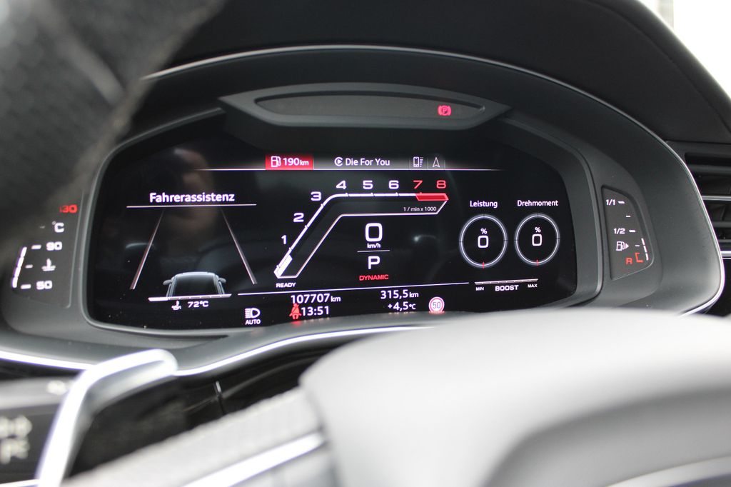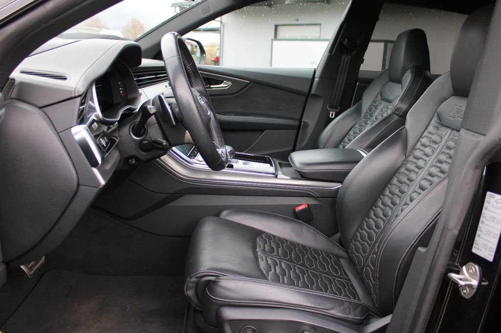 Assistenz-Paket Parken mit Remote Parklenkassistent, Assistenz-Paket Stadt, Assistenz-Paket Tour, Audi Smartphone Interface, Außenspiegel Carbon / Audi exclusive, Außenspiegel elektr. verstell-, heiz- und anklappbar, mit Abblendautomatik und Memory, Bremssättel Rot lackiert, Diebstahlsicherung für Räder (Felgenschlösser), Head-up-Display, Isofix-Aufnahmen für Kindersitz an Beifahrersitz, Kombiinstrument digital (virtual cockpit plus) mit RS-Design, LM-Felgen 10,5x23 (5-Y-Speichen, Rotor-Design, titangrau matt, glanzgedreht), Matrix-LED-Scheinwerfer, Metallic-Lackierung, Optik-Paket Aluminium matt, Panoramadach vorn elektrisch, hinten fest, Servoschliessung für Türen, Sitzbezug / Polsterung: Leder Valcona perforiert, Wabensteppung, belüftet), Sound-System Bang & Olufsen, Standheizung, Stoßfänger RS-Version, Voll-Lackierung, Verglasung hinten abgedunkelt (Privacyverglasung)