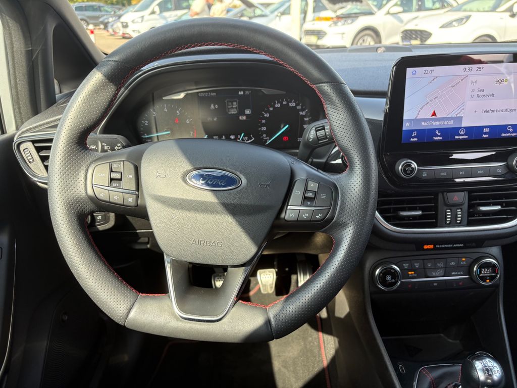 Dieser gepflegte Ford Fiesta aus dem Jahr 2019 präsentiert sich in elegantem Silber-Metallic mit schwarzem Stoffinterieur. Mit nur einem Vorbesitzer und der umweltfreundlichen Euro 6-Einstufung bietet dieser Kompaktwagen eine ausgezeichnete Balance zwischen Wirtschaftlichkeit und Fahrkomfort. Der 3-Zylinder Benzinmotor mit 999 ccm Hubraum und 140 PS sorgt für spritzige Fahrleistungen bei gleichzeitig niedrigem Verbrauch, unterstützt durch das Start-Stopp-System. Die Ausstattung umfasst ein modernes Infotainmentsystem mit Navigation, Touchscreen, Apple CarPlay und Android Auto. Für zusätzliche Sicherheit sorgen Spurhalteassistent, Totwinkelwarner und Einparksensoren hinten. Die Klimaautomatik, beheizbare Vordersitze und beheizte Frontscheibe bieten auch bei kalten Temperaturen optimalen Komfort.- Umfangreiches Infotainmentsystem mit Navigation, DAB-Radio und Bluetooth