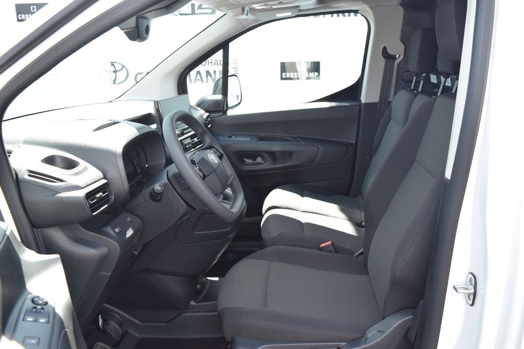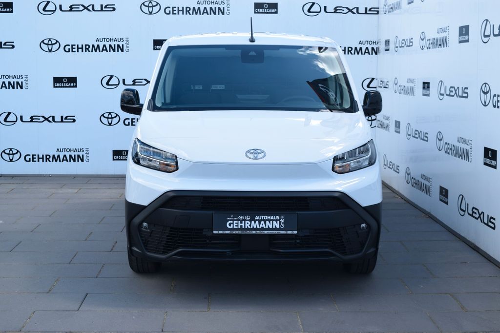 Airbag Fahrer-/Beifahrerseite, Audiobedienung am Lenkrad, Audiosystem: Multimedia Toyota Pro Touch, Außenspiegel elektr. verstell- und heizbar, Beifahrerdoppelsitz, Bi-LED-Scheinwerfer, Bremsassistent, Comfort-Paket, DAB-Tuner (Radioempfang digital), Einparkhilfe hinten, Elektr. Bremskraftverteilung, Fahrassistenz-System: Bergabfahrkontrolle (HDC / DAC), Fahrassistenz-System: Berganfahrkontrolle (HAC), Fahrassistenz-System: Fernlichtassistent (Abblendautomatik Fahrlicht, AHB), Fahrassistenz-System: Pre-Collision-System (PCS), Fahrassistenz-System: Sicherheitssystem Toyota Connect mit automatischem Notruf (eCall), Freisprechanlage mit Audiostummschaltung, Frontscheibe Verbundglas, Heckflügeltüren ohne Verglasung, Karosserie/Aufbau: Kasten, Laderaumtrennwand, Modellpflege, Motor 1,2 Ltr. - 81 kW 12V Turbo KAT, Multimedia Display (8,0 Zoll), Otto-Partikelfilter (OPF), Parkbremse elektrisch (EPB), Radstand 2785 mm, Reifendruck-Kontrollsystem, Schadstoffarm nach Abgasnorm Euro 6d, Schadstoffarm nach Abgasnorm Euro 6e, Schiebetür Fahrgast-/Laderaum rechts, Seitenairbag vorn, Seitenschutzleisten, Steckdose (12V-Anschluß) Koffer-/Laderaum, Stop&Go-System (TSGS), Toyota Smart Cargo
