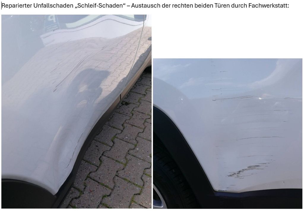 1. Gekauft wurde das Auto beim Jeep Fachhändler mit einem reparierten Unfallschaden (rechte Vorder und Hintertür waren verkratzt). Kein Unfall, nur eine "Schleif-Schramme". Beide Türen wurden durch neue ersetzt. (siehe Bild)