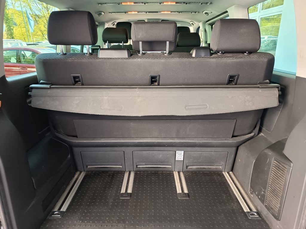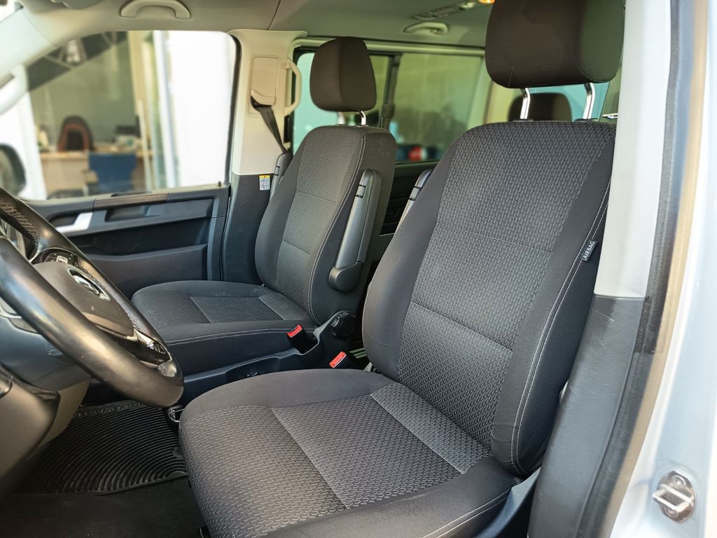 Abdeckung Schiebetürleiste, Airbag Beifahrer abschaltbar, Airbag Fahrer-/Beifahrerseite, Außenspiegel asphärisch, links, Außenspiegel konvex, rechts, Außenspiegel und Türgriffe außen schwarz, Bodenbelag im Fahrerhaus: Teppich, Bodenbelag im Lade-/Fahrgastraum Kunststoff, Campingtisch, Doppeltonfanfare, Fahrassistenz-System: Bremsassistent (HBA), Fahrassistenz-System: Multikollisionsbremse (Multi Collision Brake), Frontscheibe Verbundglas getönt, Funkschlüssel (2) klappbar, Haltegriffe A-Säulen, Handschuhfach abschließbar, Heckklappe mit Verglasung, Heckscheibe heizbar, mit Wischanlage, Innenleuchten im Lade-/FG-Raum: Trittstufenleuchten, Innenraumfilter: Pollenfilter, Karosserie/Aufbau: Bus, Kindersicherung an den Schiebetüren, Kraftstofftank: 70 Ltr., Lenksäule (Lenkrad) verstellbar, Mobiltelefon Schnittstelle Bluetooth, Motor 2,0 Ltr. - 110 kW TDI, Nichtraucher-Paket, Radstand 3000 mm, Reifenkontroll-Anzeige, Schadstoffarm nach Abgasnorm Euro 6, Schiebetür Lade-/Fahrgastraum rechts, SCR-System (AdBlue-Technologie), Seitenairbag / Kopfairbag (Curtain-Airbag) vorn, Sitzbezug / Polsterung: Stoff, Sitze im Fahrerhaus: Beifahrersitz Komfort, Sitze im Fahrerhaus: Fahrersitz Komfort, Sitze im Fahrerhaus: Lendenwirbelstützen Fahrer- und Beifahrersitz, Sitze im Lade-/FG-Raum: 2.Reihe, 3er-Sitzbank, Sonnenblenden mit Spiegel, Start/Stop-Anlage Motor, Steckdose (12V-Anschluß) im Fahrerhaus, Stoßfänger in Wagenfarbe, Wärmeschutzverglasung, Zentralverriegelung mit Fernbedienung und Innenbetätigung, Zuheizer, Zul. Gesamtgewicht 3,00 t