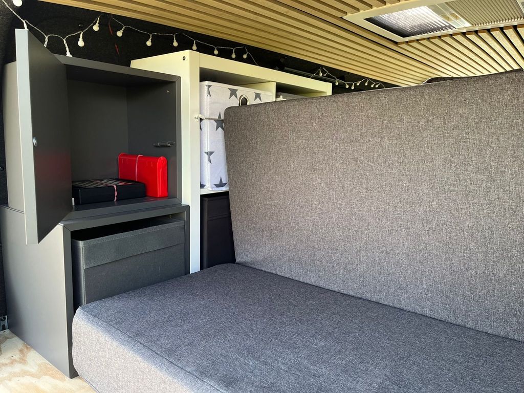 Die Liegefläche kann auf 2m verlängert werden. Ist dann für bis zwei Person mit einer Fläche von 2 m x 1,4 m. Unter dem Bett ist viel Stauraum für Ikeakisten und einer Trockentoilette.