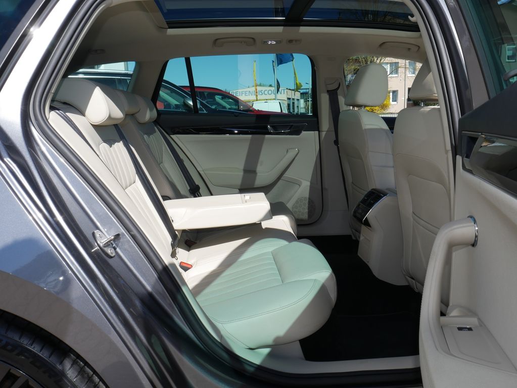 Climatronic ( 3-Zonen ) mit Klimabedienteil hinten; Sitzbezüge in Leder; 2-Speichen-Multifunktionslederlenkrad mit Heizung und mit Schaltwippen DSG, mit schwarze Umnähung; elektrische Fensterheber vorne + hinten; Sonnenrollo für die Seitenscheiben hinten - mechanisch; "Virtual Cockpit"; Netztrennwand; Lenksäule (Lenkrad) höhenverstellbar; Lenksäule (Lenkrad) längsverstellbar; Ablagefach für Regenschirm; Steckdose (12V-Anschluß) im Koffer-/Laderaum; Steckdose (12V-Anschluß) in Mittelkonsole vorn
