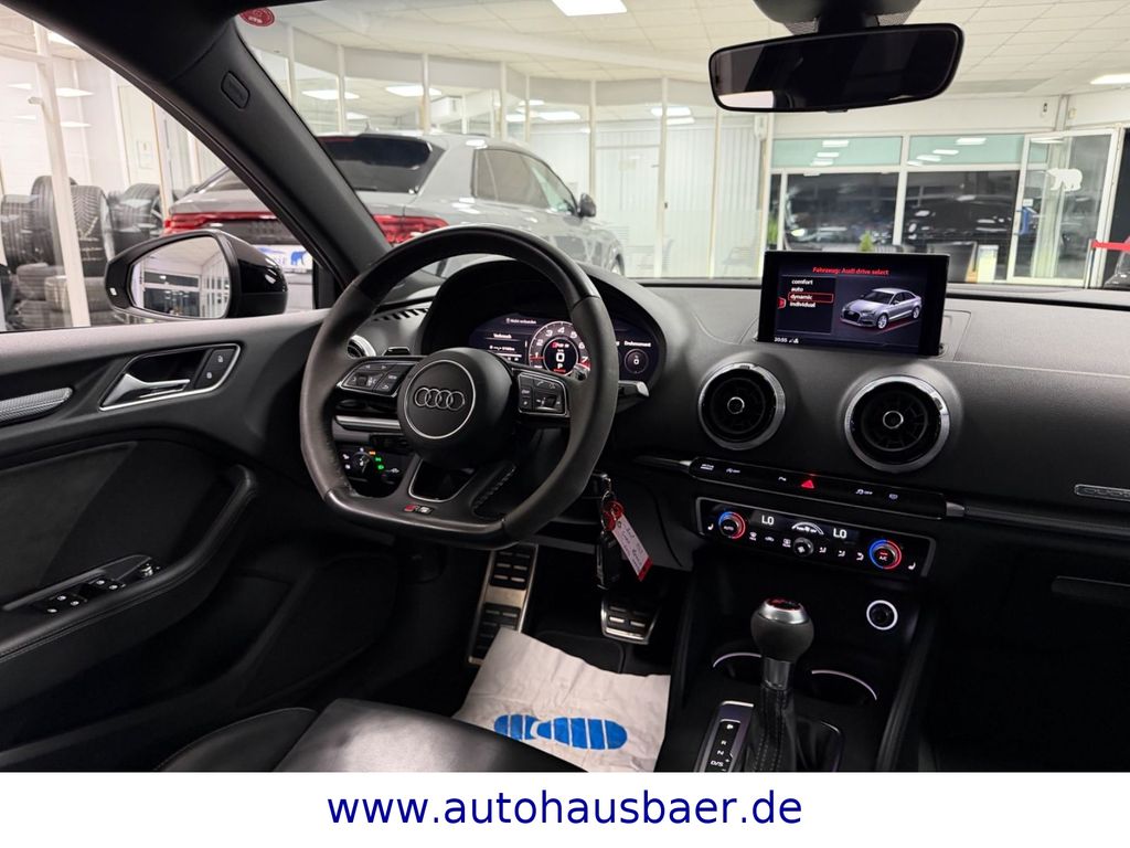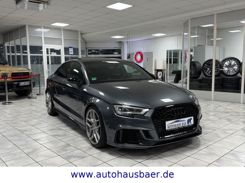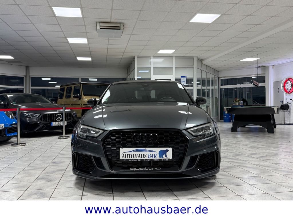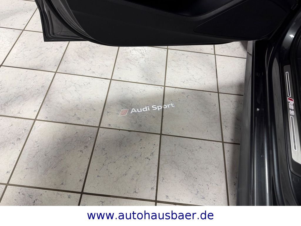 Ablage- und Gepäckraum-Paket, Adaptives Bremslicht, Airbag Fahrer-/Beifahrerseite, Antriebs-Schlupfregelung (ASR) mit EDS, Audi Drive Select, Außenspiegel elektr. verstellbar, beide, Außenspiegel schwarz, Bremsassistent, Bremssättel Schwarz lackiert, Dachhimmel Stoff, Dachkantenspoiler, Einparkhilfe vorn und hinten, akustisch und optisch mit selektiver Anzeige (APS Plus), Einstiegsleisten mit Aluminiumeinlage und Schriftzug, beleuchtet, Fahrassistenz-System: Bremsassistent (Folgekollision), Fahrer-Informations-System (FIS) mit Farbdisplay, Frontscheibe Akustikglas, Fußmatten Velours, Gepäckraumabdeckung / Rollo, Heckklappenöffnung automatisch, Heckleuchten LED mit dynamischem Blinklicht, Heckspoiler Wagenfarbe, Innenausstattung: Aluminium-Optik, Innenausstattung: Dekoreinlagen 3D-Optik Luv, Isofix-Aufnahmen für Kindersitz, Karosserie: 4-türig, Kombiinstrument elektronisch, Komfort-Klimaautomatik 2-Zonen, Kopf-Airbag-System (Sideguard), Kotflügelverbreiterung, Lenkrad (Sport/Leder - 3-Speichen, unten abgeflacht) mit Multifunktion und Schaltfunktion, Licht-Paket, Motor 2,5 Ltr. - 294 kW 20V TFSI, Multi-Media-Interface MMI Basic Plus / MMI Radio Plus, Pedale und Fußstütze in Edelstahl, Progressivlenkung, Reifen-Reparaturkit, Reifenkontroll-Anzeige, RS-Frontstoßfänger Sport-Design, Rücksitzlehne geteilt/klappbar, Schadstoffarm nach Abgasnorm Euro 6d-TEMP, Schalt-/Wählhebelgriff Alcantara / Mikrofaser, Seitenairbag vorn, Sitzbezug / Polsterung: Leder Feinnappa mit Logo-Prägung in Vordersitzlehnen, Sportsitze vorn, Start/Stop-Anlage, Stoßfänger Sport-Design (S-line), Stoßfänger Sport-Design mit Diffusoreinsatz hinten, Universal-Schnittstelle Bluetooth, Wärmeschutzverglasung grün getönt, Sitzheizung vorn