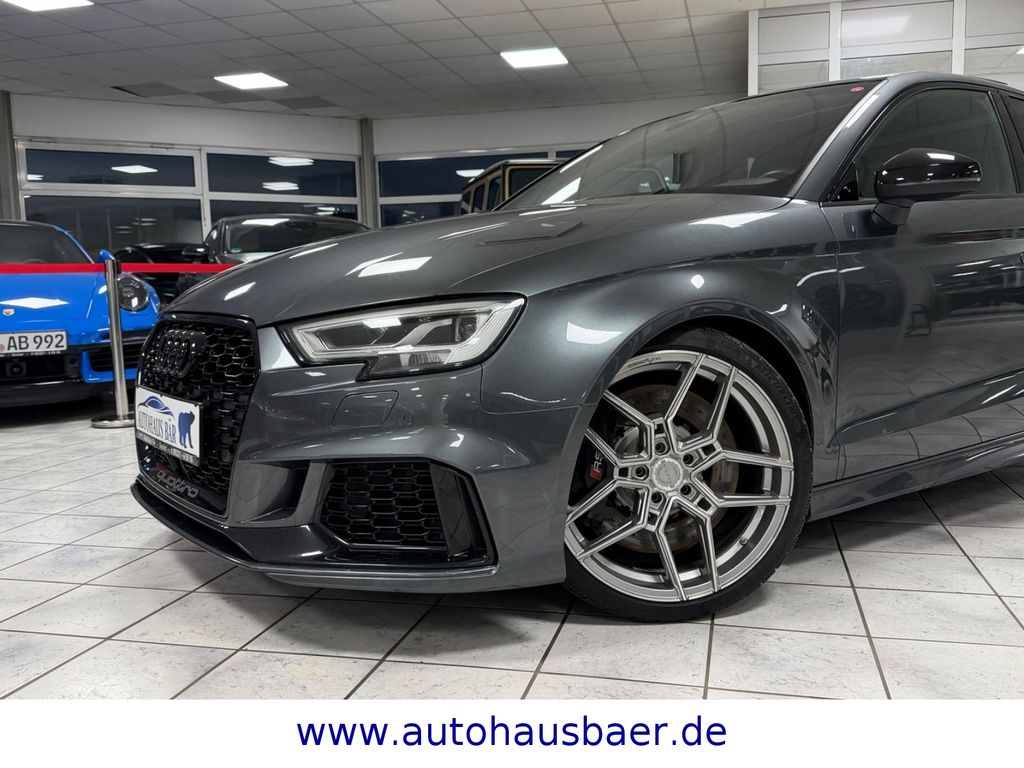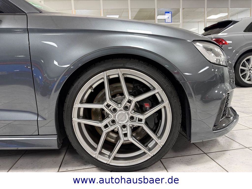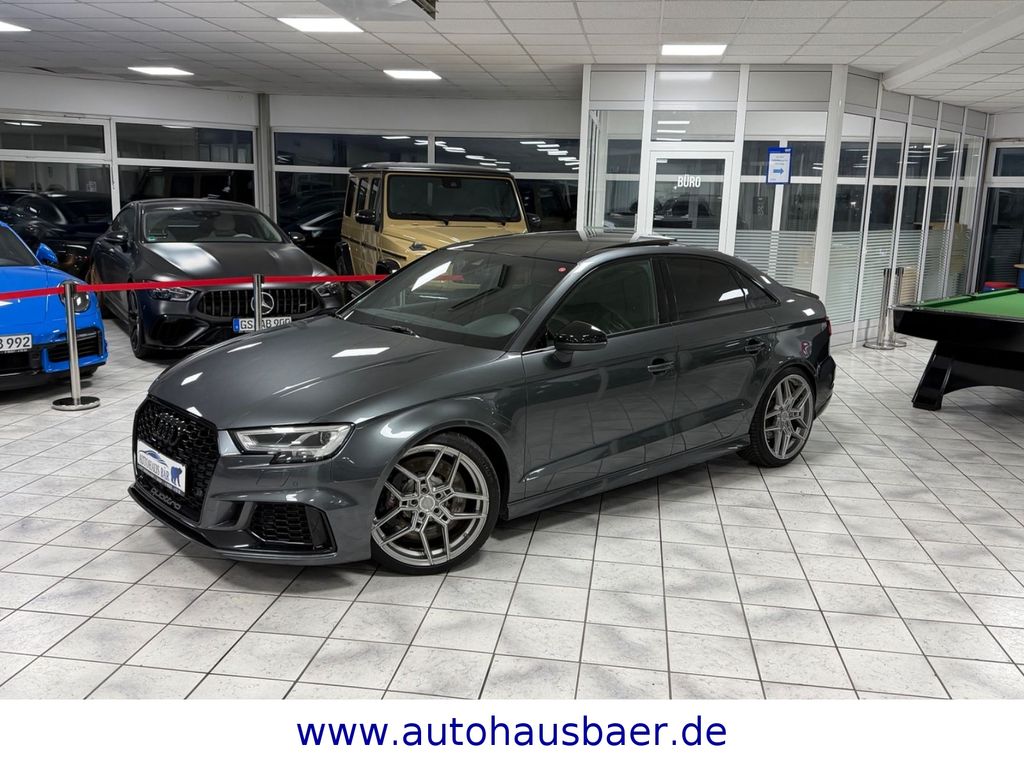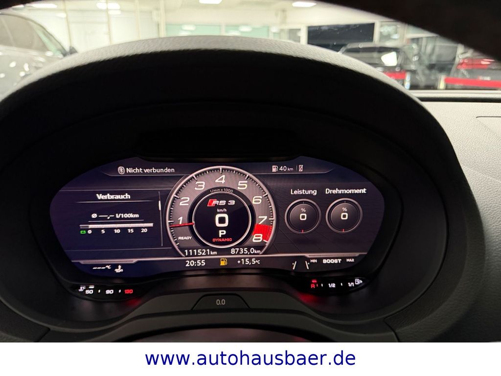 Ablage- und Gepäckraum-Paket, Adaptives Bremslicht, Airbag Fahrer-/Beifahrerseite, Antriebs-Schlupfregelung (ASR) mit EDS, Audi Drive Select, Außenspiegel elektr. verstellbar, beide, Außenspiegel schwarz, Bremsassistent, Bremssättel Schwarz lackiert, Dachhimmel Stoff, Dachkantenspoiler, Einparkhilfe vorn und hinten, akustisch und optisch mit selektiver Anzeige (APS Plus), Einstiegsleisten mit Aluminiumeinlage und Schriftzug, beleuchtet, Fahrassistenz-System: Bremsassistent (Folgekollision), Fahrer-Informations-System (FIS) mit Farbdisplay, Frontscheibe Akustikglas, Fußmatten Velours, Gepäckraumabdeckung / Rollo, Heckklappenöffnung automatisch, Heckleuchten LED mit dynamischem Blinklicht, Heckspoiler Wagenfarbe, Innenausstattung: Aluminium-Optik, Innenausstattung: Dekoreinlagen 3D-Optik Luv, Isofix-Aufnahmen für Kindersitz, Karosserie: 4-türig, Kombiinstrument elektronisch, Komfort-Klimaautomatik 2-Zonen, Kopf-Airbag-System (Sideguard), Kotflügelverbreiterung, Lenkrad (Sport/Leder - 3-Speichen, unten abgeflacht) mit Multifunktion und Schaltfunktion, Licht-Paket, Motor 2,5 Ltr. - 294 kW 20V TFSI, Multi-Media-Interface MMI Basic Plus / MMI Radio Plus, Pedale und Fußstütze in Edelstahl, Progressivlenkung, Reifen-Reparaturkit, Reifenkontroll-Anzeige, RS-Frontstoßfänger Sport-Design, Rücksitzlehne geteilt/klappbar, Schadstoffarm nach Abgasnorm Euro 6d-TEMP, Schalt-/Wählhebelgriff Alcantara / Mikrofaser, Seitenairbag vorn, Sitzbezug / Polsterung: Leder Feinnappa mit Logo-Prägung in Vordersitzlehnen, Sportsitze vorn, Start/Stop-Anlage, Stoßfänger Sport-Design (S-line), Stoßfänger Sport-Design mit Diffusoreinsatz hinten, Universal-Schnittstelle Bluetooth, Wärmeschutzverglasung grün getönt, Sitzheizung vorn