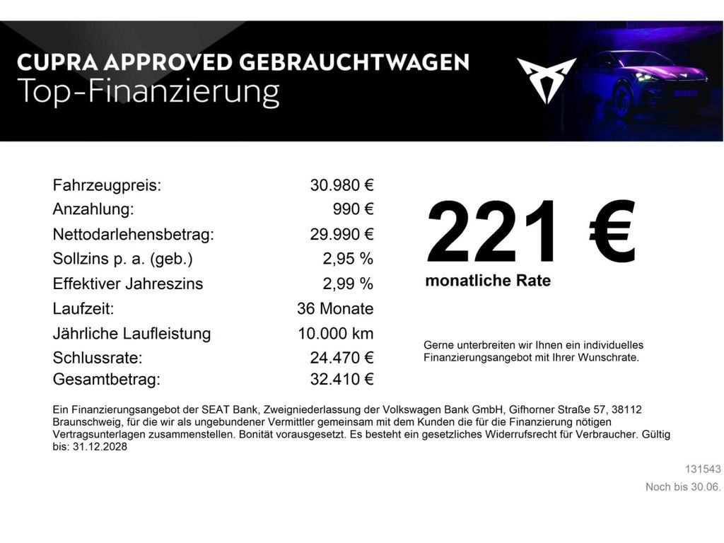 - Komfort: Climatronic ( 3-Zonen ) mit Klimabedienteil hinten, CUPRA CONNECT Plus 3 Jahre, Drive Profile, Fensterheber mit Komfortschaltung und Abschaltsicherung, elektrisch, Fernlichtassistent, Kessy advanced, schlüsselloses Schließ- und Startsystem mit Safe Sicherung, Komfortöffnung Heckklappe (Virtuelles Pedal), Leuchtweitenregulierung,autom.dynamisch (reguliert sich im Fahrbetrieb), Müdigkeits- und Aufmerksamkeitserkennung, Online-Dienst, mit OCU, mit Head Unit Codierung, ohne WFS-Verbund, Parklenkassistent IPA (Intelligent Park Assist), Seitenscheiben ab 2. Sitzreihe und Heckscheibe dunkel getönt, Sitzheizung für Vordersitze getrennt regelbar, Speedlimiter mit Intelligent Speed Assist (ISA), Sprachsteuerung, Top View Kamera inkl. Rückfahrkamera, Verkehrszeichenerkennung