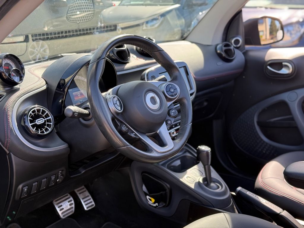 Ablage-Paket, Bodypanel Titania Grey Matt, Cool & Media-Paket, Einparkhilfe hinten, Erste Hilfe-Kasten / Verbandkasten, Fahrassistenz-System: aktiver Bremsassistent, Fußmatten Velours, Komfort-Paket, Kraftstofftank: vergrößert, LED & Sensor-Paket, LM-Felgen vorn/hinten: 5x16 / 5,5x16 (5-Doppelspeichen), Mittelarmlehne vorn klappbar, Sitzheizung, Sound-System JBL, Tridion-Sicherheitszelle Graphite-grey, Warndreieck, Windschott, Airbag Fahrer-/Beifahrerseite, Außenspiegel schwarz, Außentemperaturanzeige, Blinkleuchten seitlich Weiß, Bordcomputer, Design- und Ausstattungslinie passion, Direktlenkung mit variabler Lenkkraft-Unterstützung,BRABUS Sportpaket, Fahrassistenz-System: Berganfahr-Assistent, Fensterheber elektr. vorn, mit Einklemmschutz, Getriebe 6-Gang - Doppelkupplungsgetriebe DCT, Isofix-Aufnahmen für Kindersitz, Karosserie: 2-türig, Knieairbag Fahrerseite, Kombiinstrument mit Monochrom-Display, Kopf-Airbag-System / Seitenairbag, Kühlermaske schwarz, genarbt, Lenkrad (Sport/Leder, 3-Speichen), Motor 0,9 Ltr. - 66 kW Turbo KAT, Reifendruck-Kontrollsystem, Schadstoffarm nach Abgasnorm Euro 6, Sitzlehne vorn rechts umklappbar, Sonnenblende links mit Spiegel, Sonnenblende rechts mit Spiegel, Start/Stop-Anlage, Steckdose (12V-Anschluß), Tritop Verdeck, Verzurrösen Koffer-/Laderaum