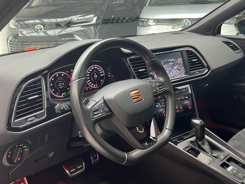 3. Bremsleuchte, Ablage-Paket, Ablagetasche an Vordersitzlehnen, Airbag Beifahrerseite abschaltbar, Airbag Fahrer-/Beifahrerseite, Ambiente-Beleuchtung LED, Antriebs-Schlupfregelung (ASR), Antriebsart: Allradantrieb, Audio-Navigationssystem mit Touchscreen Farbbildschirm, Außenspiegel elektr. verstell-, heiz- und anklappbar, beide, Außenspiegel schwarz, Außentemperaturanzeige, Bordcomputer, Bremsassistent, Bremssättel Rot lackiert mit Schriftzug, Dachhimmel schwarz, Dynamic-Paket, Elektron. Differentialsperre (EDS), Fahrassistenz-System: Berganfahr-Assistent (Hill-Holder), Fahrassistenz-System: Fahrprofilauswahl (SEAT Drive Profile), Fahrassistenz-System: Umfeldbeobachtungssystem (Front assist) mit City-Notbremsfunktion, Fensterheber elektrisch hinten, Gepäckraumabdeckung / Rollo, Handschuhfach beleuchtet, Heckspoiler, Innenraumlicht-Paket LED, Isofix-Aufnahmen für Kindersitz, Karosserie: 5-türig, Klimaanlage Climatronic 2-Zonen, Knieairbag Fahrerseite, Kofferraumbeleuchtung, Kombiinstrument digital (virtual cockpit), Kopf-Airbag-System, Kopfstützen hinten (3-fach), Kopfstützen vorn verstellbar, Laderaumboden variabel und herausnehmbar, Lendenwirbelstütze Sitz vorn links, verstellbar, Lendenwirbelstütze Sitz vorn rechts, verstellbar, Licht- und Sicht-Paket, LM-Felgen, Mittelarmlehne hinten, Modellpflege, Motor 2,0 Ltr. - 221 kW 16V TSI, Parkbremse elektrisch, Reifenkontroll-Anzeige, Rücksitzlehne geteilt/klappbar (1/3-2/3), Rücksitzlehnen umklappbar mit Fernentriegelung im Kofferraum, Schadstoffarm nach Abgasnorm Euro 6, Schalt-/Wählhebelgriff Leder, Scheinwerfer LED, Seitenairbag, Seitenscheiben hinten und Heckscheibe abgedunkelt, Sitz vorn links höhenverstellbar, Sitz vorn rechts höhenverstellbar, Sitzbezug / Polsterung: Leder, Sitzbezug / Polsterung: Leder / Alcantara, Sonnenblende links mit Spiegel (beleuchtet), Sonnenblende rechts mit Spiegel (beleuchtet), Sport-Fahrwerk FR / Cupra, Start/Stop-Anlage, Steckdose (12V-Anschluß) im Koffer-/Laderaum, Steckdose (12V-Anschluß) vorn, Wärmeschutzverglasung