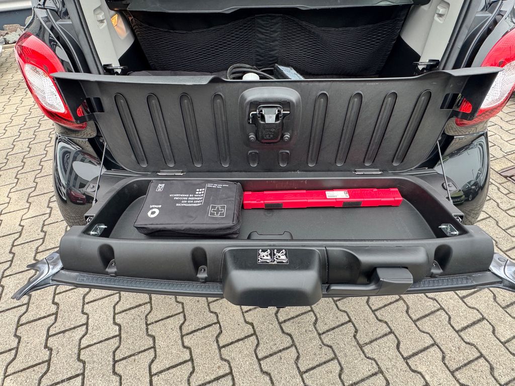 Airbag Beifahrerseite abschaltbar, Airbag Fahrer-/Beifahrerseite, Akustischer Fußgängerschutz (Soundmodul), Außentemperaturanzeige, Blinkleuchten seitlich Weiß, Bodypanel Tiefschwarz / Deep Black (Farbcode ECAO), Bordcomputer, Cool & Audio-Paket, Design- und Ausstattungslinie passion, Elektromotor 60 kW (cont. 41 kW), Fahrassistenz-System: aktiver Bremsassistent, Fahrassistenz-System: Berganfahr-Assistent, Fahrzeug mit HV-Kauf-Batterie, Fensterheber elektr. vorn, mit Einklemmschutz, Heckscheibenwischer, Isofix-Aufnahmen für Kindersitz, Karosserie: 3-türig, Knieairbag Fahrerseite, Kombiinstrument mit Monochrom-Display, Kopf-Airbag-System / Seitenairbag, Kühlermaske schwarz, genarbt, Ladekabel für öffentliche Ladesäulen, Modellbezeichnung geändert, Modellpflege, Radioempfang digital (DAB), Reifendruck-Kontrollsystem, Schalt-/Wählhebelgriff Leder, Seitenairbag, Sitzlehne vorn rechts umklappbar, Steckdose (12V-Anschluß), Tridion-Sicherheitszelle schwarz (Farbcode), Verzurrösen Koffer-/Laderaum, Volldach, Zusatzinstrumente für Batterieladezustand und Leistungsanzeige