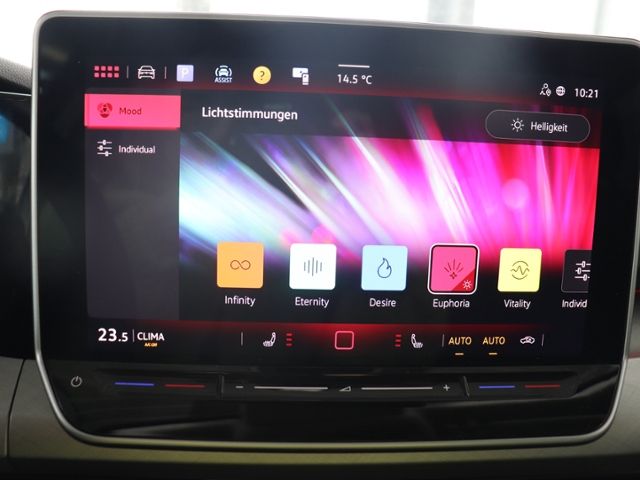 LED-Rückleuchten; Fahrlichtschaltung automatisch, mit LED-Tagfahrlicht sowie Begrüßungs- und Verabschiedungslicht; Leuchtweitenregulierung dynamisch; Scheinwerfer und Tagfahrlicht LED; Blendfreies Fernlicht; Ambientebeleuchtung 10-farbig; 2 LED-Leseleuchten vorn und 2 hinten; Umfeldbeleuchtung mit Lichtprojektion