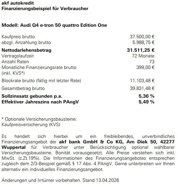 Audi Q4 e-tron 50 quattro als Edition One!!! Der Audi Q4 e-tron als seltenes Sondermodell Edition One zeichnet sich als leistungsstarkes und geräumiges Elektro-SUV aus. Zu den wesentlichen positiven Eigenschaften gehören der kraftvolle Allradantrieb, das großzügige Platzangebot und eine solide Ladegeschwindigkeit. Mit der 82 kWh großen Batterie sind Alltagsreichweiten von 275 - 560 km möglich, je nach Einsatz und Fahrprofil. An der Wallbox lädt er problemlos mit 11 KW und am CCS Schnellader mit bis zu 175KW in 33 Minuten von 10% - 80%.