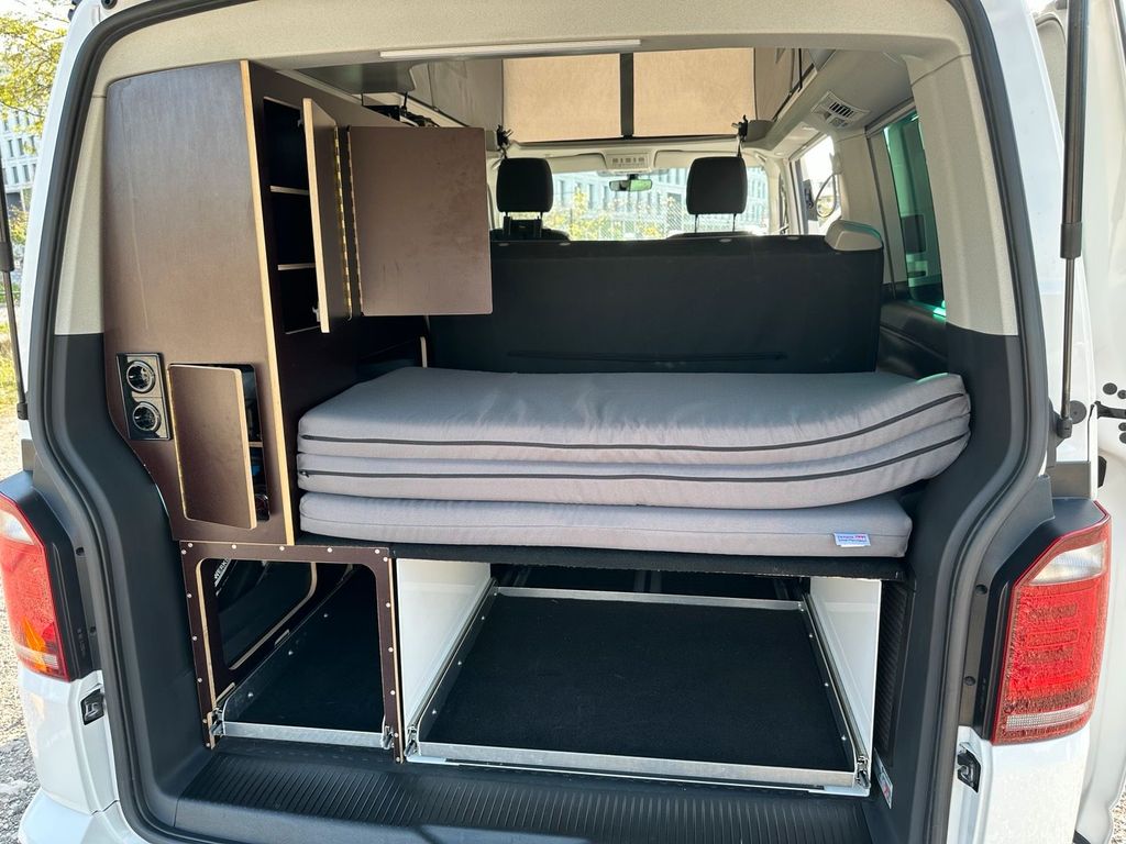 - Campingausbau: Modularer Campingausbau inkl. Dometic CFX28 Kompressorkühlschrank (Neupreis 550), Wassersystem mit Tauchpumpe, Wasserhahn zum Ausziehen (auch als Außendusche aus Schiebefenster nutzbar), Gaskocher herausnehmbar, 12V-Steckdosen, 230V-Steckdosen, Landstromanschluss mit FI-Absicherung im Motorraum, zwei Schwerlastauszugschubladen hinten, maßgefertigter Topper (Liegefläche unten 120x190), Neupreis über 8.000. Der Ausbau lässt sich innerhalb von maximal 30 Minuten vollständig ausbauen (hauptsächlich Flügelschrauben) und ist ausschließlich über die Multischienen in Boden befestigt (keine Verschraubung in der Verkleidung, Verkleidung ist im Originalzustand)