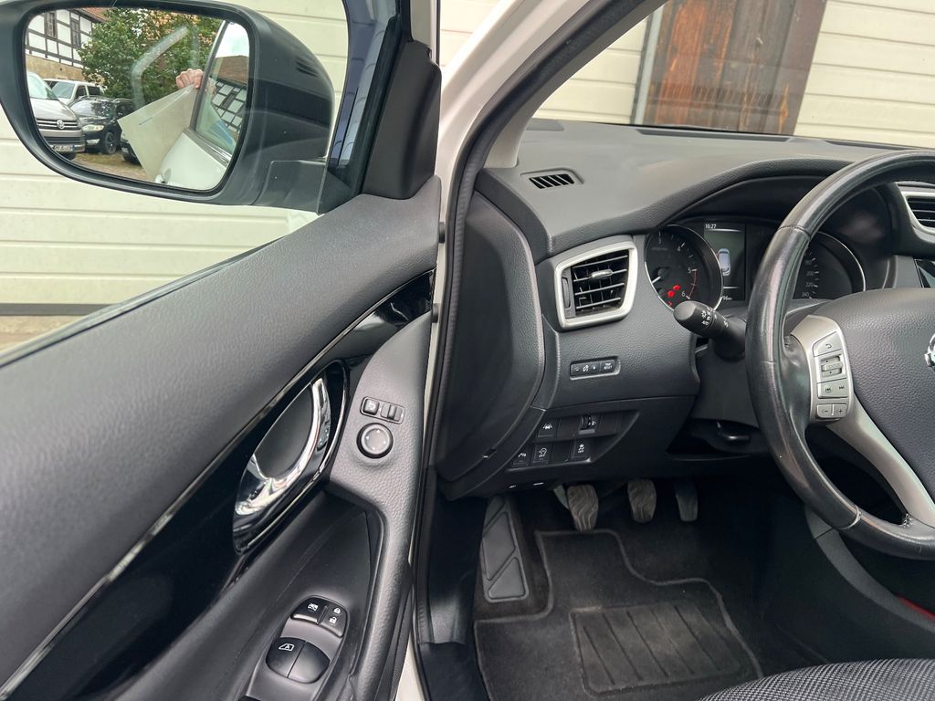 3. Bremsleuchte, Airbag Beifahrerseite abschaltbar, Airbag Fahrer-/Beifahrerseite und Seitenairbag vorn, Ambiente-Beleuchtung, Audio Navigationssystem Nissan Connect mit Touchscreen-Farbdisplay, Audiobedienung am Lenkrad, Audiosystem: Radio mit CD- und MP3-Player, Automatische Fahrlichtschaltung, AUX-IN-Anschluss (AUX-IN), Außenspiegel elektr. anklappbar, Außenspiegel elektr. verstell- und heizbar, Außenspiegel Wagenfarbe, Außentemperaturanzeige, Blinkleuchte in Außenspiegel integriert, Bordcomputer, Bremsassistent (Nissan Brake-Assist), Coming-Home-Lichtfunktion (Friendly Lightning), Design-Paket II, Elektr. Bremskraftverteilung (EBD), Fahrassistenz-Paket Visia, Fahrassistenz-System: Aktive Fahrkomfortregelung (Fahrwerksdämpfung), Fahrassistenz-System: Berganfahr-Assistent, Fahrassistenz-System: Kurvenbremskontrolle (Aktive Spurkontrolle), Fahrer-Informations-System (FIS) mit Farbdisplay, Fensterheber elektrisch vorn + hinten, Fernentriegelung Tankklappe, Freisprechanlage Bluetooth, Frontscheibe Verbundglas, Gepäckraumabdeckung / Rollo, Getränkehalter in Mittelkonsole, Gurtstraffer, Handschuhfach beleuchtet, Heckscheibe heizbar, Innenraumfilter: Pollenfilter, Isofix-Aufnahmen für Kindersitz, Kamerasystem Around View, Karosserie: 5-türig, Klimaautomatik 2-Zonen, Kopf-Airbag-System, Kopfstützen vorn und hinten verstellbar, Lendenwirbelstütze Sitz vorn links, Lenksäule (Lenkrad) höhen-/längsverstellbar, Leseleuchte vorn, Mittelarmlehne hinten, Motor 1,6 Ltr. - 96 kW dCi Turbodiesel KAT, Nebelschlussleuchte, Parkbremse elektrisch, Radstand 2646 mm, Reifen-Reparaturset, Reifendruck-Kontrollsystem, Rücksitz geteilt/klappbar, Schadstoffarm nach Abgasnorm Euro 6, Schalt-/Wählhebelgriff Leder, Schaltpunktanzeige, Scheibenwischer mit Intervallschaltung, Sitz vorn links höhenverstellbar, Sitz vorn rechts höhenverstellbar, Sitzbezug / Polsterung: Stoff, Sitzheizung vorn, Sonnenblenden mit Spiegel, Start-Stop-Knopf, Start/Stop-Anlage, Steckdose (12V-Anschluß) in Mittelkonsole, Türgriffe innen verchromt, Wärmeschutzverglasung mit UV-Schutz