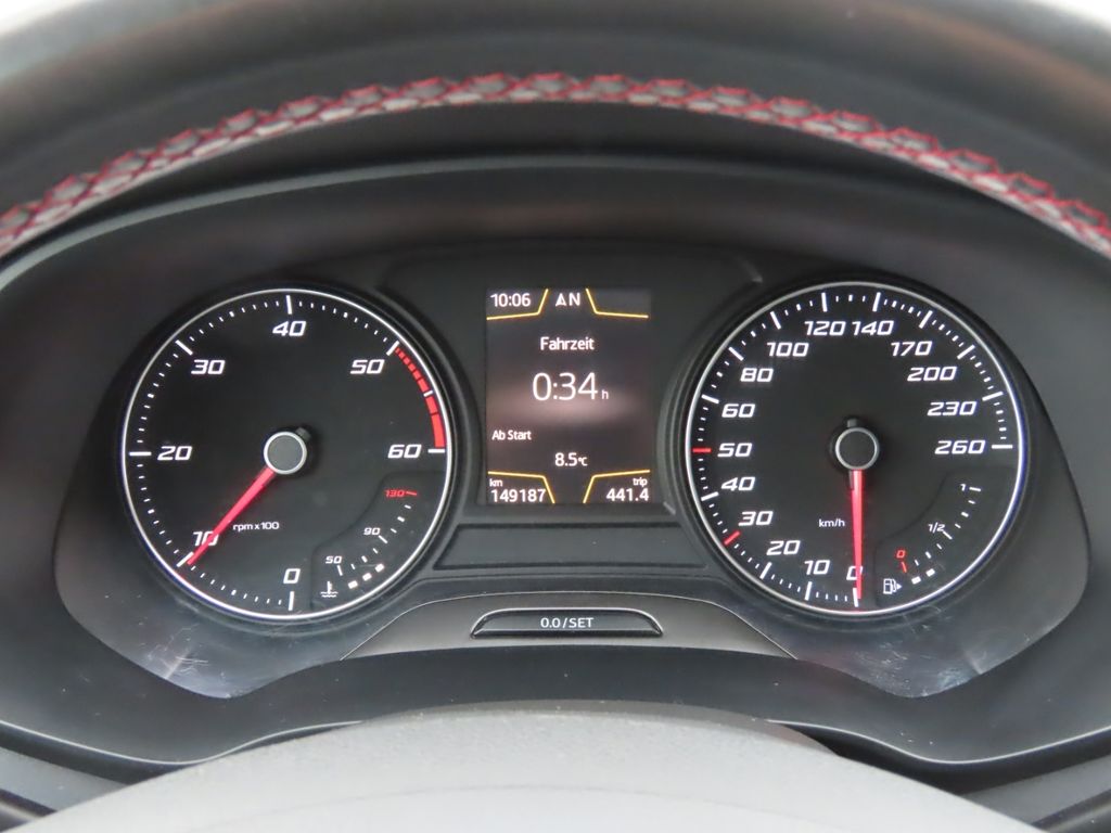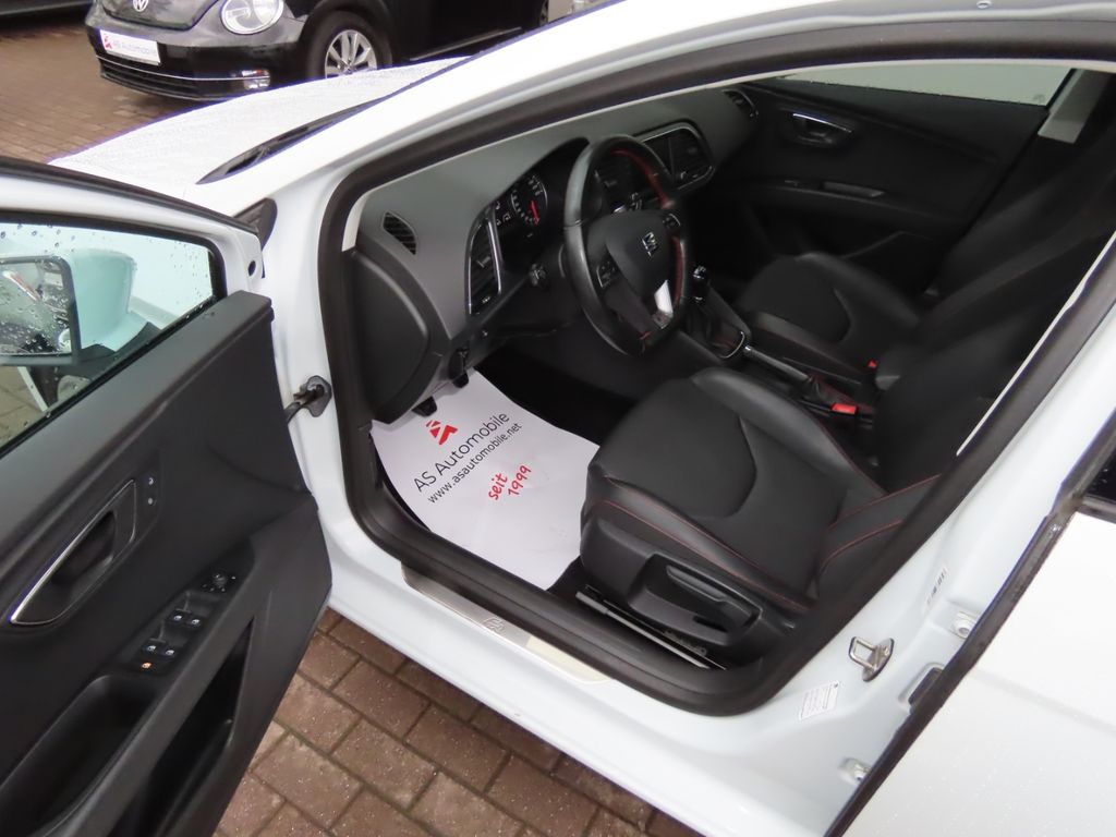 - Weiteres: Antriebs-Schlupfregelung (ASR), BORDCOMPUTER, Geschwindigkeits-Regelanlage (Tempomat), Rußpartikelfilter, Schalt-/Wählhebelgriff Leder, Reifen-Reparaturset, Knieairbag Fahrerseite, Heckleuchten LED, Außenspiegel elektr. verstell-, heiz- und anklappbar, beide, Rücksitzlehne geteilt/klappbar (1/3-2/3), Sportsitze vorn, LM-Felgen, Lendenwirbelstütze Sitz vorn rechts, verstellbar, Außenspiegel mit Spiegelabsenkung, rechts, Mittelkonsole vorn mit Mittelarmlehne, Becherhalter, Ablagebox und Luftdüsen hinten, Außenspiegel elektr. anklappbar, Stau-/Ablagefach unter Sitze vorn, Scheinwerfer-Reinigungsanlage (SRA), USB-Anschluss, Audio-Navigationssystem mit Touchscreen Farbbildschirm, Scheinwerfer LED, Airbag Fahrer-/Beifahrerseite, Anti-Blockier-System (ABS), Fensterheber elektrisch vorn, Wegfahrsperre (elektronisch), Kopf-Airbag-System, Innenausstattung: Chrom-Applikationen, Reifenkontroll-Anzeige, Seitenairbag, Stoßfänger lackiert, Außenspiegel elektr. verstellbar (mit Memory), Metallic-Lackierung, Außentemperaturanzeige, Beifahrerairbag abschaltbar, Berg-Anfahr-Assistent (Hill-Holder), Berg-Anfahr-Assistent und Elektron. Differentialsperre, Blinkleuchten LED in Außenspiegel integriert, Bremsassistent, Climatronic 2-Zonen, Einparkhilfe vorn und hinten, optisch, Elektron. Differentialsperre (EDS), Elektron. Stabilitätskontrolle (ESC), Elektron. Stabilitäts-Programm, Euro 6, Fahrprofilauswahl (SEAT Drive Profile), Fensterheber elektrisch vorn und hinten, getönte Scheiben - Privacy Glass, Handschuhfach beleuchtet, Innenraumlicht-Paket LED, iPod-Anschluss, Isofix-Aufnahmen für Kindersitz, Kennzeichenbeleuchtung LED, Kopfstützen hinten, Lendenwirbelstütze, Motor 2,0 Ltr. - 110 kW TDI, Nebelscheinwerfer mit Abbiegelicht, Scheibenwaschdüsen heizbar, Servotronic, Sitzheizung vorn, Sitzhöhenverstellung, Sitzhöhenverstellung Fahrersitz, Sport/Lederlenkrad, Sport-Fahrwerk FR / Cupra, Start/Stop-Anlage, Tagfahrlicht, Wärmeschutzverglasung, Winter-Paket, ZV mit Fernbedienung