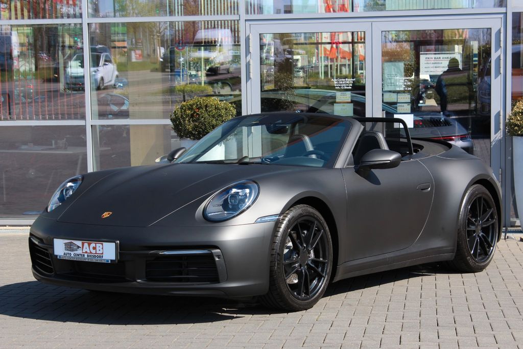 Airbag Fahrer-/Beifahrerseite, Antriebsart: Heckantrieb, Außenspiegel asphärisch, links, Außenspiegel elektr. verstell- und heizbar, beide, Blinkleuchten LED, Cabrio, Connect Plus (Bluetooth, Apple CarPlay, WLAN, Vehicle-Tracking-System), Dachhimmel Stoff, Diebstahl-Warnanlage mit Innenraumüberwachung, Drehzahlmesser, Einschaltautomatik für Fahrlicht, Einstiegsblenden mit Modellbezeichnung (Aluminium), Fahrassistenz-System: Berganfahr-Assistent (Hill-Holder), Fahrassistenz-System: Kollisionswarnsystem mit Bremseingriff und Fußgängererkennung, Fahrassistenz-System: Park-Assistent vorn und hinten inkl. Rückfahrkamera, Fußmatten, Getriebe 8-Gang - Doppelkupplungsgetriebe (PDK), Getränkehalter, Hauptscheinwerfer LED, Heckleuchten LED, Heckscheibe heizbar, Heckspoiler, Innenausstattung: Leder, Serienlederfarbe, Innenraumfilter: Aktivkohlefilter (Geruchsfilter), Interieur-Paket: Diamar Dark Silver, Isofix-Aufnahmen für Kindersitz an Beifahrersitz, Karosserie: 2-türig, Keyless Drive, Kleiderhaken Sitzrückenlehne Leder, Klimaautomatik 2-Zonen, Kopf-Airbag-System Porsche Side Impact Protection System (POSIP), Kopf-Schulter-Airbag vorn (Thoraxbag), Lenkrad (Sport/Glattleder, 3-Speichen) mit Multifunktion, LM-Felgen, Motor 3,0 Ltr. - 283 kW Turbo KAT, Otto-Partikelfilter (OPF), Parkbremse elektrisch, Porsche Active Suspension Management (PASM), Porsche Communications Management (PCM) inkl. Online - Navigationsmodul, Porsche Traction Management (PTM), Radioempfang digital (DAB+), Reifendruck-Kontrollsystem, Schadstoffarm nach Abgasnorm Euro 6d, Schriftzug Modellreihe, Schwellerabdeckung / -verkleidung lackiert, Sport Taste, Start/Stop-Anlage, Turbo, Uni-Lackierung, Vehicle-Tracking-System (PVTS), Verdeckbetätigung elektrisch, Verglasung getönt, Windschott elektrisch u.v.m.