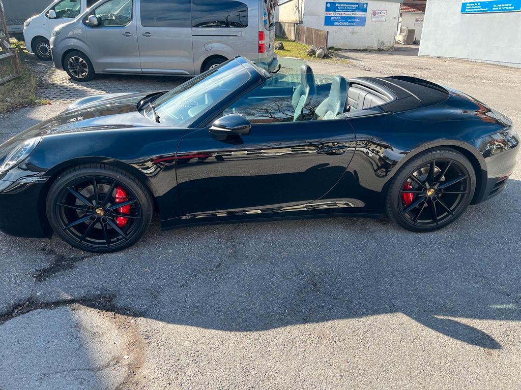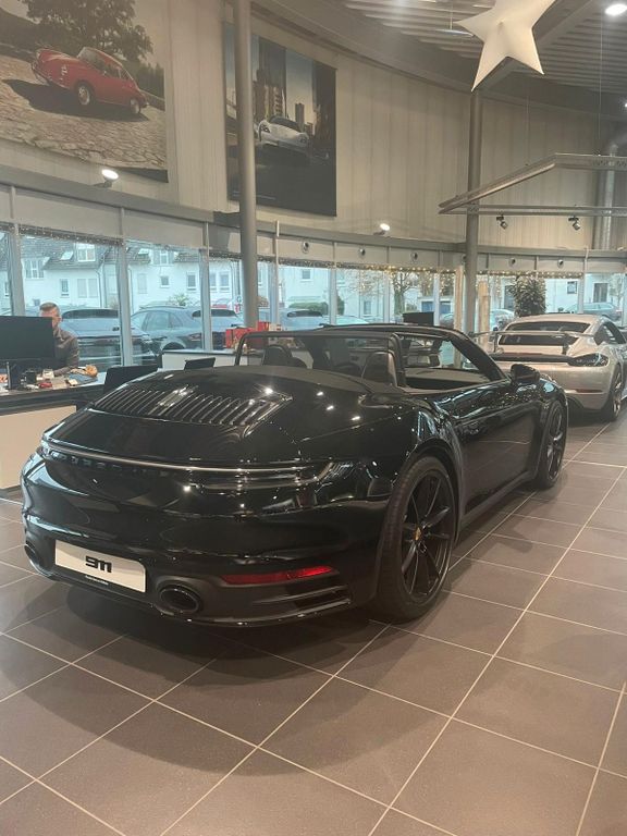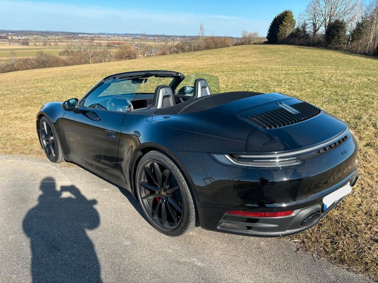 Porsche 911 Carrera S Cabriolet (992) in Schwarz mit 450 PS, 8-Gang-PDK und deutscher Ausführung. Das Fahrzeug ist unfallfrei, wurde am 07.02.2024 erstmals zugelassen und weist erst 400 km Laufleistung auf. Die MwSt. ist ausweisbar.Zur Ausstattung zählen unter anderem LED-Hauptscheinwerfer im Exclusive Design, Sportabgasanlage mit schwarzen Endrohren, BOSE Sound-System, Sitzheizung vorn, Sportsitze Plus (elektrisch verstellbar, 4-Wege), ParkAssistent vorn und hinten inkl. Rückfahrkamera und Surround View, elektrisch anklappbare Außenspiegel, Servolenkung Plus sowie das GT-Sportlenkrad in Leder mit Schaltfunktion.