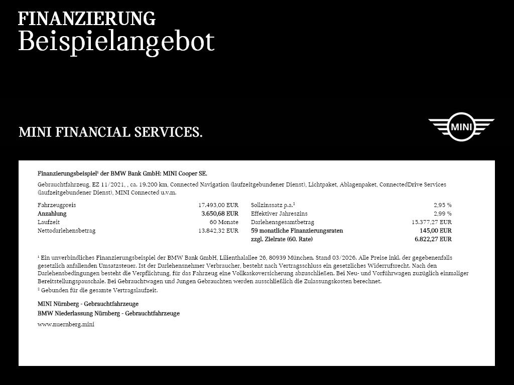 Ein unverbindliches Finanzierungsbeispiel der BMW Bank GmbH, Lilienthalallee 26, 80939 München. Stand 03/2026. Alle Preise inkl. der gegebenenfalls gesetzlich anfallenden Umsatzsteuer. Ist der Darlehensnehmer Verbraucher, besteht nach Vertragsschluss ein gesetzliches Widerrufsrecht. Nach den Darlehensbedingungen besteht die Verpflichtung, für das Fahrzeug eine Vollkaskoversicherung abzuschließen. Bei Neu- und Vorführwagen zuzüglich einmaliger Bereitstellungspauschale. Bei Gebrauchtwagen und Jungen Gebrauchten werden ausschließlich die Zulassungskosten berechnet.