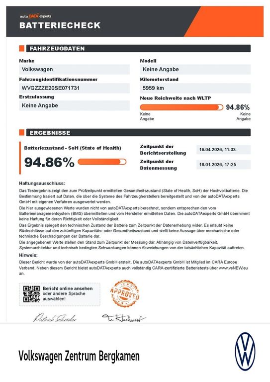- Das Fahrzeug verfügt über ein Batterie Zertifikat.