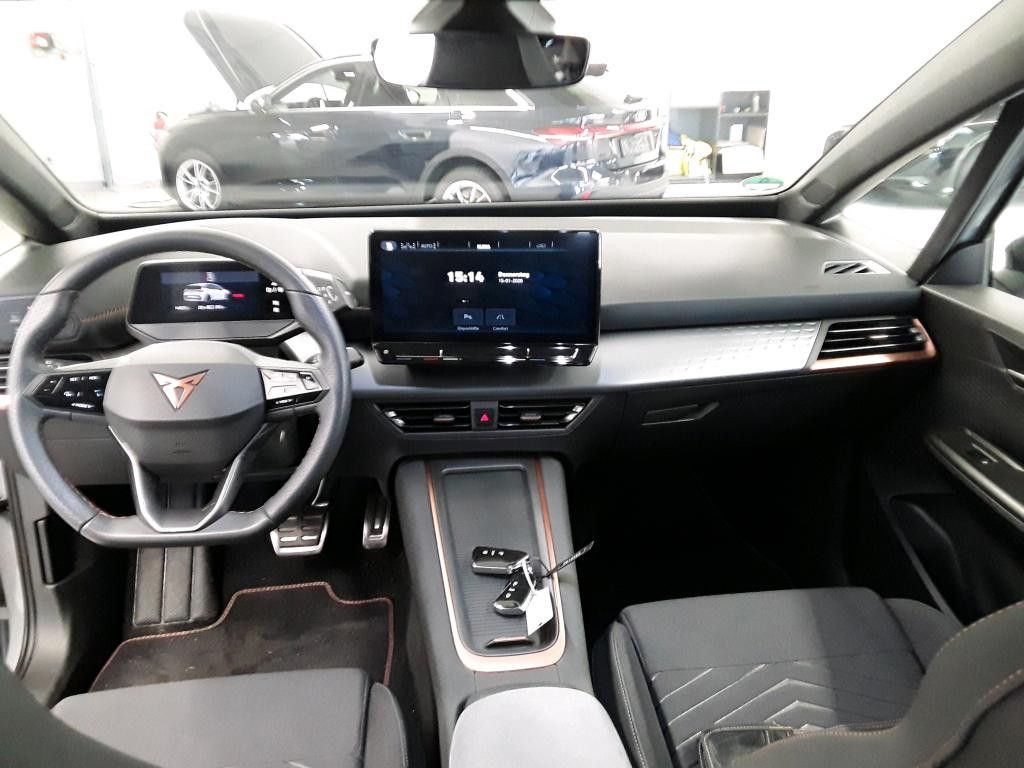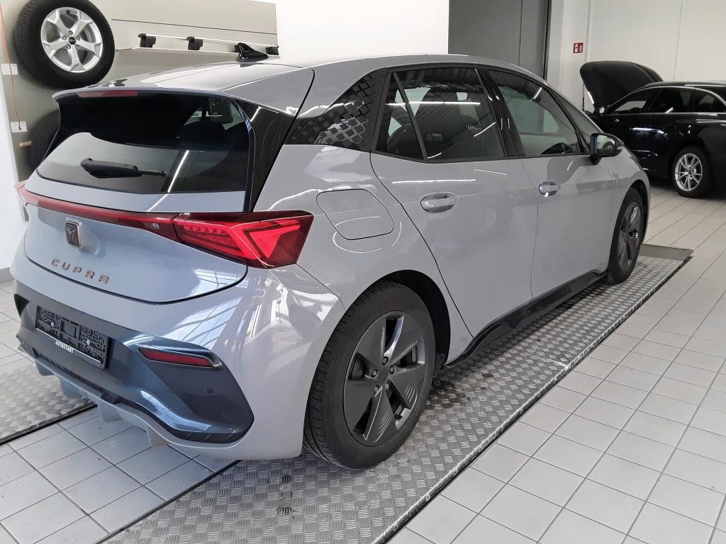 5 Lautsprecher, Airbag Beifahrerseite abschaltbar, Airbag Fahrer-/Beifahrerseite, Akustischer Fußgängerschutz, Außensound (e-sound / AVAS), Ambiente-Beleuchtung LED, Antriebs-Schlupfregelung (ASR), Außenspiegel elektr. verstell-, heiz- und anklappbar mit Spiegelabsenkung und Welcome Light, Blinkleuchten LED in Außenspiegel integriert, Bluetooth-Schnittstelle mit Freisprecheinrichtung integriert, Dachhimmel schwarz, Einparkhilfe vorn und hinten, Elektromotor 150 kW (cont. 70 kW), Fahrassistenz-System: Fahrprofilauswahl (CUPRA Drive Profile), Fensterheber elektrisch vorn + hinten mit Komfortschaltung, Fußraumbeleuchtung LED, Heckleuchten Voll-LED mit Lichtband (Infinite Light), Heckspoiler Wagenfarbe (Dachspoiler), HV-Batterie 62 kWh brutto / 58 kWh netto, Innenspiegel mit Abblendautomatik, Isofix-Aufnahmen für Kindersitz an Beifahrersitz und Rücksitz (inkl. i-Size-Kindersitze), Karosserie: 5-türig, Klimaanlage Climatronic 2-Zonen, Kombiinstrument digital (virtual cockpit), Kopf-Airbag-System, Ladekabel mit Typ 2-Stecker (Mode 3), LM-Felgen, Notrufsystem, Parkbremse elektrisch, Pedale Aluminium-Design, Rücksitzlehne geteilt/klappbar (1/3-2/3), Schnellladevorrichtung (CCS-Ladedose), Schriftzug auf der Heckklappe, Seitenairbag, Seitenairbag vorn mitte (Central Airbag), Sitz vorn links höhenverstellbar, Sitzbezug / Polsterung: Stoff, Sonnenblende links mit Spiegel (beleuchtet), Sonnenblende rechts mit Spiegel (beleuchtet), Sport-Schalensitze vorn mit integrierten Kopfstützen, USB-Ladeanschlüsse (2-fach, Typ C) für 2.Sitzreihe, Warnanlage für Sicherheitsgurt-System, Wärmeschutzverglasung