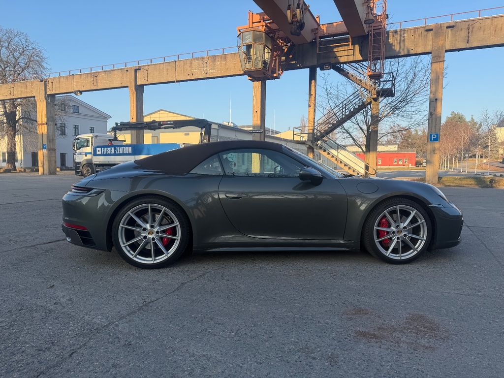 Verkauft wird ein schönes 992.1 Carrera 4S Cabriolet in aventuringrünmetallic mit braunen Verdeck und Lederausstattung in Clubleder, trüffelbraun. Das angeboten Fahrzeug wurde immer im Porsche Zentrum gewartet und ist unfallfrei. TÜV sowie Garantie wurden im Mai 25 erneuert. Die Porsche Approved ist noch bis 05/26 gültig.Fahrzeug befindet sich aktuell auf Winterrädern (silber), Sommerräder sind ebenfalls zum Fahrzeug dazu und werden einmal neu lackiert (glänzend schwarz) und bekommen zur neuen Saison neue Reifen. Die Winterräder sind 4 Jahre alt und haben noch über 5mm Profiltiefe. Zwei Winterfelgen sind leicht beschädigt.