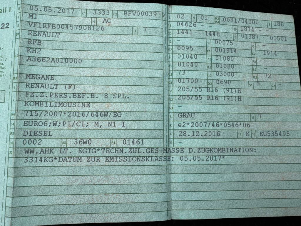 1- Hand, Scheckheft gepflegt bei Renault, Zahnriemen gewechselt bei 98000km, Klimaautomatik, Navigation, Tempomat, Sitzheizung, Multifunkion-Lederlenkrad, Teilleder Ausstattung mit Sportsitzen, 4x el. Fensterheber, Zentralverriegelung Keyless-2 Karten, Komfort-Paket, Parkdistance, Anhängerkupplung, 6- Gang Getriebe, Sommer und Winterreifen auf Alufelgen, Bremsen vorne und hinten kmpl. neu, HU 10/2026, COC, EURO 6.Sonderausstattung: