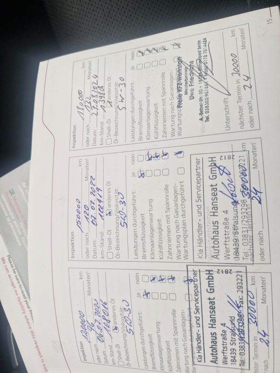 Weitere Ausstattung:3. Bremsleuchte, Airbag Beifahrerseite abschaltbar, Airbag Fahrer-/Beifahrerseite, Aktives Bremslicht (ESS), Anzeigeinstrumente Supervision mit LCD Display, Audio-Navigationssystem KIA (8 Zoll), Außenspiegel elektr. anklappbar, Außenspiegel elektr. verstell- und heizbar, beide, Außenspiegel elektr. verstellbar, beide, Außenspiegel Wagenfarbe, Bi-Xenon-Scheinwerfer, Blinkleuchte in Außenspiegel integriert, Bordcomputer, Bremsassistent, Chromeinfassung Seitenfenster, DAB-Tuner (Radioempfang digital), Dachreling, Dachspoiler, Einparkhilfe hinten, Einparkhilfe vorn, Einschaltautomatik für Fahrlicht, Fahrassistenz-System: Bergabfahr-Assistent, Fahrassistenz-System: Berganfahr-Assistent, Fahrassistenz-System: City-Notbremsfunktion, Fahrassistenz-System: Fahrprofilauswahl (Drive Mode), Fahrassistenz-System: Fernlichtassistent, Fahrassistenz-System: Parklenkassistent (Smart Parking Assist System, SPAS), Fahrassistenz-System: Querverkehrs-Assistent (Rear Cross Traffic Alert, RCTA), Fahrassistenz-System: Spurwechselassistent, Fahrassistenz-System: Verkehrszeichenerkennung, Fensterheber elektrisch vorn + hinten, Freisprecheinrichtung Bluetooth, Frontscheibe mit Wischerablagenheizung, Fußmatten, Füllstandsanzeige Scheibenwaschanlage, Gegenlenkunterstützung (Vehicle Stability Management, VSM), Getränkehalter hinten, Gurtstraffer mit Kraftbegrenzer, Heckklappenöffnung elektr., Heckleuchten LED, Heckscheibe heizbar, Heckscheibenwischer, Induktionsladeschale für Smartphone, Innenspiegel mit Abblendautomatik, Isofix-Aufnahmen für Kindersitz, Karosserie: 5-türig, Klimaautomatik 2-Zonen, Kopf-Airbag-System vorn und hinten, Laderaumabdeckung, Lendenwirbelstütze Sitz vorn links, Lenkrad heizbar, Lenksäule (Lenkrad) höhen-/längsverstellbar, LM-Felgen, Luftausströmer im Fond mitte, Metallic-Lackierung, Mittelarmlehne hinten, Motor 2,0 Ltr. - 136 kW CRDi KAT, Multifunktion für Lenkrad, Panoramadach / Ausstelldach (Glas), Parkbremse elektrisch, Radstand 2670 mm, Reifen-Reparaturset, Reifendruck-Kontrollsystem, Rückfahrkamera, Rücksitzlehne geteilt/klappbar, Schadstoffarm nach Abgasnorm Euro 6, Schalt-/Wählhebelgriff Leder, Schaltpunktanzeige, Seitenairbag, Sicherheitsgurte vorn höhenverstellbar, Sitz vorn links elektr. verstellbar, Sitz vorn links höhenverstellbar, Sitz vorn rechts elektr. verstellbar, Sitz vorn rechts mech. höhenverstellbar, Sitzbelüftung vorn, Sitzbezug / Polsterung: Leder, Sitzheizung vorn, Sonnenblenden mit Spiegel (beleuchtet), Sound-System, Steckdose (12V-Anschluß) in Mittelkonsole, Stoßfänger Wagenfarbe, Subwoofer, Türgriffe außen mit LED-Beleuchtung, Türgriffe außen verchromt, Unterfahrschutz vorn, USB-Anschluss + AUX-IN-Anschluss, USB-Anschluss Mittelkonsole, Verglasung hinten abgedunkelt (Privacy Glass)