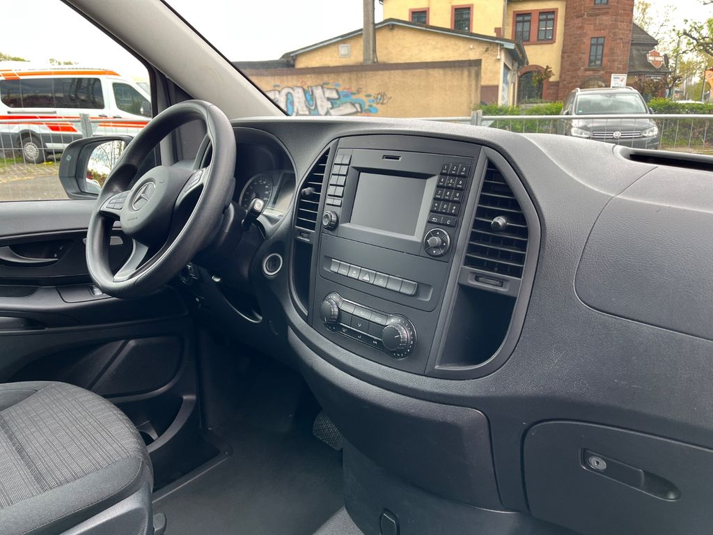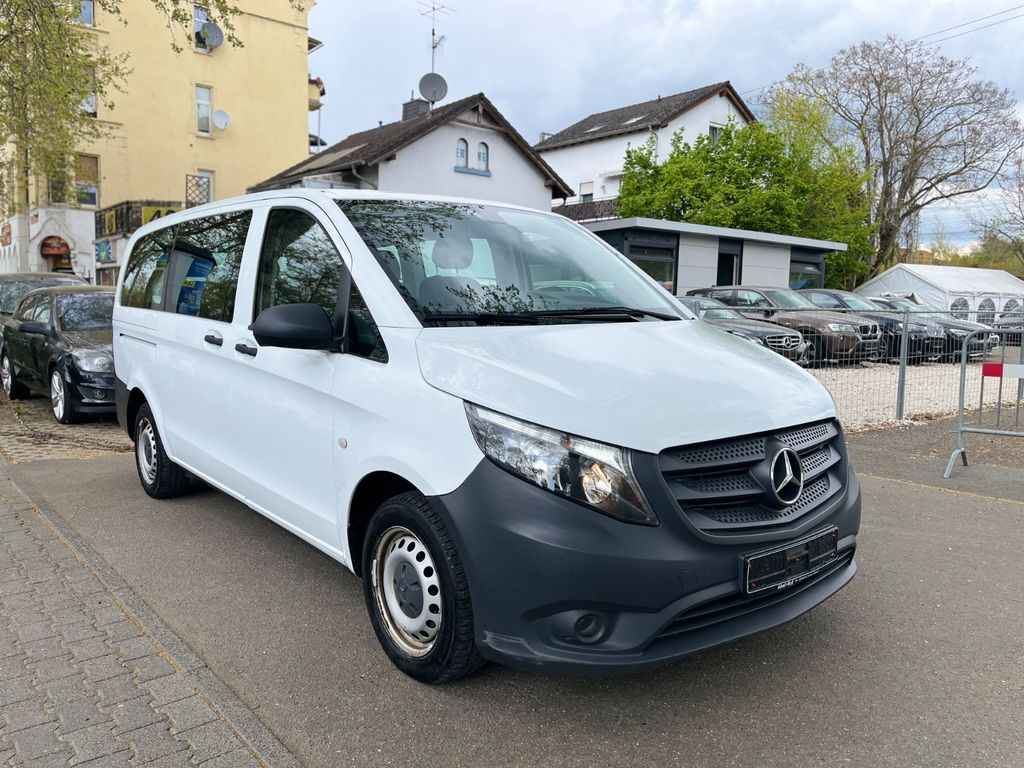 3. Bremsleuchte, Adaptives Bremslicht, Airbag Beifahrerseite, Airbag Fahrerseite, Anfahrhilfe (Berganfahr-Assistent), Anzeige für Waschwasserstand, Auflastung auf 3,1 t, Außenspiegel asphärisch, beide, Außenspiegel elektr. verstell- und heizbar, beide, Außentemperaturanzeige, Befestigungsschienen für Dachträger, BlueEfficiency-Paket, Bodenbelag: Fahrgastraum TPO, Bremsassistent, Bremssystem mit ABS+ASR, Dachverkleidung, Design- und Ausstattungslinie PRO, Einstiegsgriff hinten, Fahrassistenz-System: Anfahr-Assistent (Berganfahr-Assistent), Fahrassistenz-System: Attention-Assist (Müdigkeitserkennungs-Sensor), Fahrassistenz-System: Pannenmanagement, Fahrassistenz-System: Seitenwind-Assistent, Fenster für hintere Türen / Heckklappe mit Wisch-/Waschanlage, Fenster im Lade-/FG-Raum: - feststehend, hinten, Fenster im Lade-/FG-Raum: - feststehend, vorn links, Fenster im Lade-/FG-Raum: - feststehend, vorn rechts, Frontscheibe mit Scheibenantenne, Generator 150 A, Getriebe Automatik GTronic - (9-Stufen), Getränkehalter vorn, Gurtstraffer, Haltegriffe im Fond, Handschuhfach abschließbar, Harnstofftank (AdBlue): 24 Ltr., Heckklappe mit Verglasung, Heckscheibe heizbar, Heckscheibenwischer, Innenverkleidung gehobene Ausführung, Karosserie/Aufbau: extra lang, Karosserie/Aufbau: Kombi Standard, Kindersicherung, Kommunikationsmodul (LTE) für digitale Dienste, Kopf-Airbag-System (Windowbag), Kopf-Schulter-Airbag (Thoraxbag) Fahrer-/Beifahrerseite, Lenkrad (Lenksäule mech. verstellbar), Mercedes-Benz Notrufsystem, Motor 2,0 Ltr. - 100 kW CDI KAT, Nebelschlussleuchte, PKW-Zulassung, Pro, PTC Heater, Radstand 3430 mm, Reifendruck-Kontrollsystem, Rückspiegel innen, Schadstoffarm nach Abgasnorm Euro 6d-TEMP, Schiebetür Lade-/Fahrgastraum rechts mit Verglasung, SCR-System (AdBlue-Technologie), Sicherheitsgurt-System mit Warnanlage (Fahrer-/Beifahrerseite), Sitzbezug / Polsterung: Stoff, Sitze im Fahrerhaus: Beifahrersitz verstellbar, Sitze im Lade-/FG-Raum: 1.Reihe, 3er-Sitzbank, Klappsitz außen, Sitze im Lade-/FG-Raum: 2.Reihe, 3er-Sitzbank, Stahlfelgen 6,5x16, Vlies-Batterie 92 Ah, Warmluftkanal zum Lade-/Fahrgastraum, Wartungsintervall-Anzeige Assyst, Wärmeschutzverglasung
