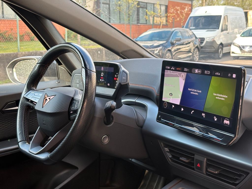 5 Lautsprecher, Airbag Beifahrerseite abschaltbar, Airbag Fahrer-/Beifahrerseite, Akustischer Fußgängerschutz, Außensound (e-sound / AVAS), Ambiente-Beleuchtung LED, Antriebs-Schlupfregelung (ASR), Außenspiegel elektr. verstell-, heiz- und anklappbar mit Spiegelabsenkung und Welcome Light, Blinkleuchten LED in Außenspiegel integriert, Bluetooth-Schnittstelle mit Freisprecheinrichtung integriert, Dachhimmel schwarz, Einparkhilfe vorn und hinten, Elektromotor 150 kW (cont. 70 kW), Fahrassistenz-System: Fahrprofilauswahl (CUPRA Drive Profile), Fensterheber elektrisch vorn + hinten mit Komfortschaltung, Fußraumbeleuchtung LED, Heckleuchten Voll-LED mit dynamischem Lichtband (Infinite Light), Heckspoiler Wagenfarbe (Dachspoiler), HV-Batterie 62 kWh brutto / 58 kWh netto, Innenspiegel mit Abblendautomatik, Isofix-Aufnahmen für Kindersitz an Beifahrersitz und Rücksitz (inkl. i-Size-Kindersitze), Karosserie: 5-türig, Klimaanlage Climatronic 2-Zonen, Kombiinstrument digital (virtual cockpit), Kopf-Airbag-System, Ladekabel mit Typ 2-Stecker (Mode 3), Notrufsystem, Parkbremse elektrisch, Pedale Aluminium-Design, Rücksitzlehne geteilt/klappbar (1/3-2/3), Schnellladevorrichtung (CCS-Ladedose), Schriftzug auf der Heckklappe, Seitenairbag, Seitenairbag vorn mitte (Central Airbag), Sitz vorn links höhenverstellbar, Sonnenblende links mit Spiegel (beleuchtet), Sonnenblende rechts mit Spiegel (beleuchtet), Sport-Schalensitze vorn mit integrierten Kopfstützen, USB-Ladeanschlüsse (2-fach, Typ C) für 2.Sitzreihe, Warnanlage für Sicherheitsgurt-System, Wärmeschutzverglasung, Innenspiegel automatisch abblendend