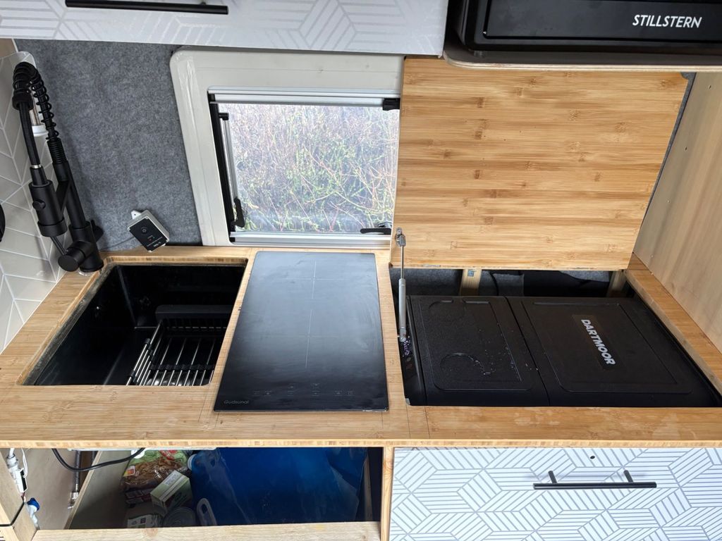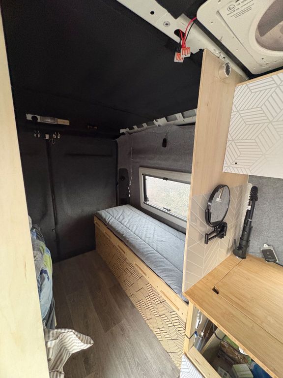 Ausbau technisch top, über 5kW Lithium, fast 1000W Solar, 100l Frisch- & Grauwasser, 2 große Fenster mit Rollos und Fliegengitter, Diesel-Standheizung, Induktionskochfeld und Kühl/Gefrierbox. 3kW Wechselrichter für alle Haushaltsgeräte, sogar genug für einen verbauten Miniofen. 187x140cm Bett und Einzelbeifahrersitz auf Drehkonsole, 30mm Armaflex-Dämmung überall. Rückfahrkamera.