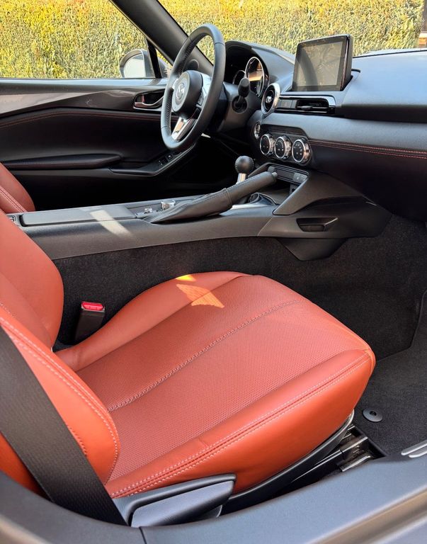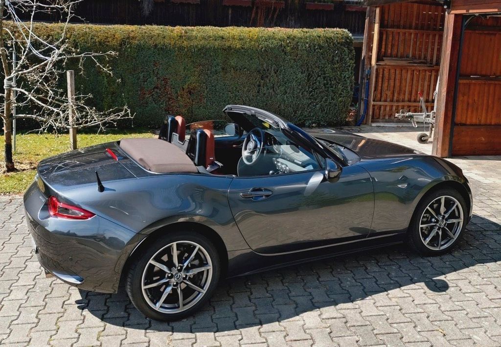 Hallo aus Altdorf in Niederbayern und ein herzliches Servus MX5 FansHier möchte ich meinen penibel gepflegten MX5 zum Kauf anbieten. Zu meinem 50. Geburtstag habe ich mir im Juni 2023 einen Traum erfüllt und meinen Kleinen als Neuwagen mit Tageszulassung und 5km gekauft. Es sollte unbedingt der große 2.0 Liter Sauger mit 184 PS und das Sondermodell Kazari in Machine grey mit Nappalederausstattung Terracotta, BOSE Soundsystem, Sitzheizung, Matrix LED usw. sein. Der 2.0 Liter wurde ja Mitte 2024 eingestellt und ist neu nicht mehr verfügbar, was ihn als kleine Wertanlage in diesem Zustand und unter 6.000 km sehr interessant macht. Die elend lange Antenne wurde noch beim Mazda Händler durch eine schnieke, kurze Stabantenne ersetzt und der Kofferraum mit einer Matte geschützt.