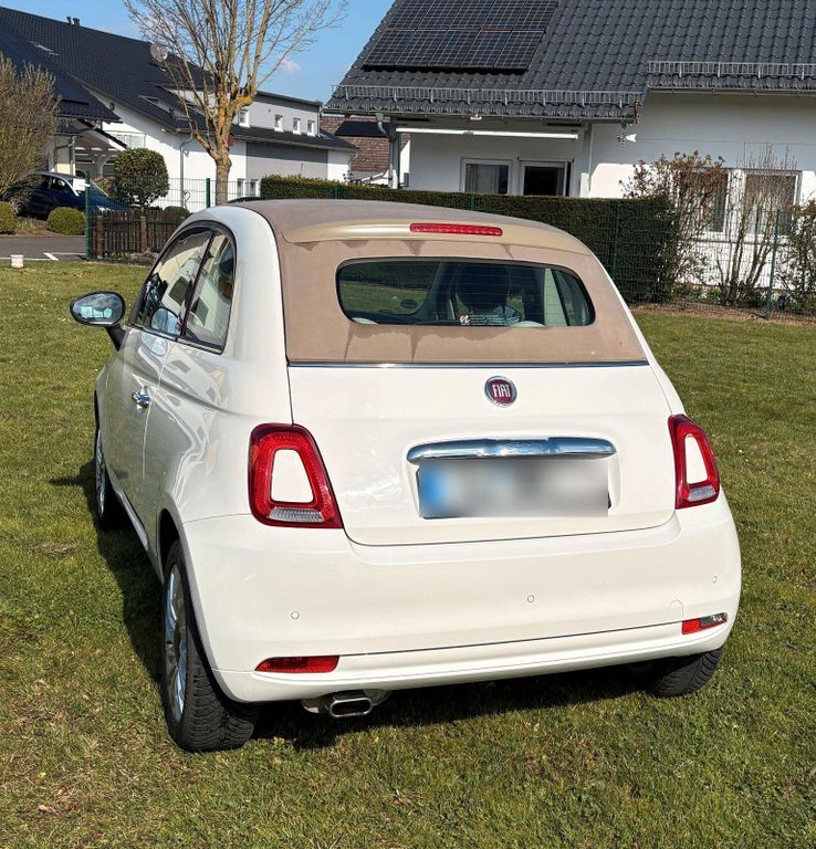 Wir bieten einen gepflegten FIAT 500 Cabrio aus dem Jahr 12.2019 in top Zustand an. Mit 69 PS, einem 1,2-Liter-Motor (1242 ccm) und einem umfangreichen Ausstattungspaket. Das elektrische Faltdach sorgt für Cabrio-Feeling, die automatische Klimaanlage steht bei kälteren Phasen zur Verfügung. Der Fiat 500 C mit hellbraunem Faltdach verfügt über ein Navi mittels Apple Car Play/Android Auto, Touchscreen, Bluetooth-Konnektivität und ein Multifunktionslenkrad aus Leder. Mit nur zwei Vorbesitzern, Scheckheftgepflegt und Euro 6-Norm ist dieses Fahrzeug besonders umweltfreundlich (grüne Umweltplakette). Die Sicherheitsausstattung umfasst ABS, ESP, Berganfahrhilfe, Front- und Seitenairbags sowie Isofix-Befestigungen. Der weiße Flitzer mit dem hellem grau-weißem Velours-Interieur bietet Platz für vier Personen und hat u. a. ein Sportpaket und glänzende Alufelgen.