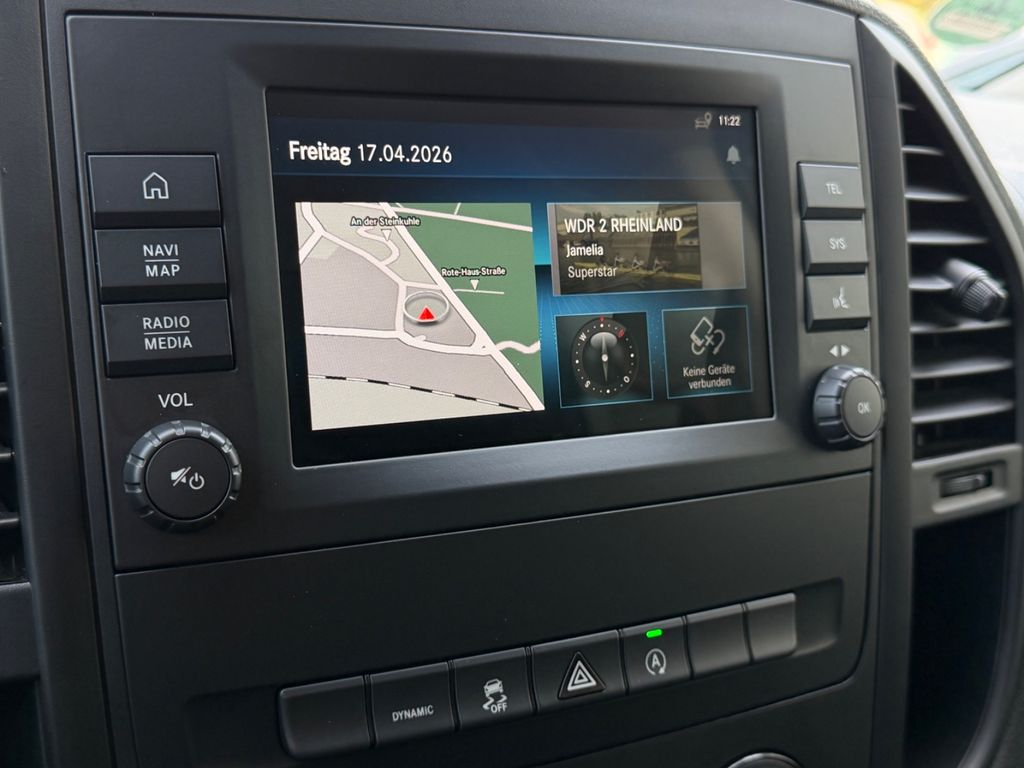 Anhängelast 2500 kg, Audio-Navigationssystem Audio 40 (DAB+, Bluetooth, USB), DAB-Tuner (Radioempfang digital), Fahrassistenz-Paket, Fußmatten Allwetter, Getränkehalter hinten, Hecktür mit Verglasung (Öffnungswinkel 180 Grad), Innen- und Umfeldbeleuchtung, Klimaautomatik Fond (Tempmatik), Kraftstofftank: vergrößert, Park-Paket, Reserveradhalter unter Rahmenende inkl. Wagenheber, Schiebetür Lade-/Fahrgastraum links, Sitz-Komfort-Paket, Sitze im Fahrerhaus: Beifahrersitz mit Lendenwirbelstütze, Sitze im Fahrerhaus: Fahrersitz mit Lendenwirbelstütze, Stahlfelgen 6,5x17, Steckdose (12V-Anschluß) im Lade-/Fahrgastraum, Tempomat mit Abstandsregelung / Distronic Plus, Zweiwege Lautsprecher vorn und hinten