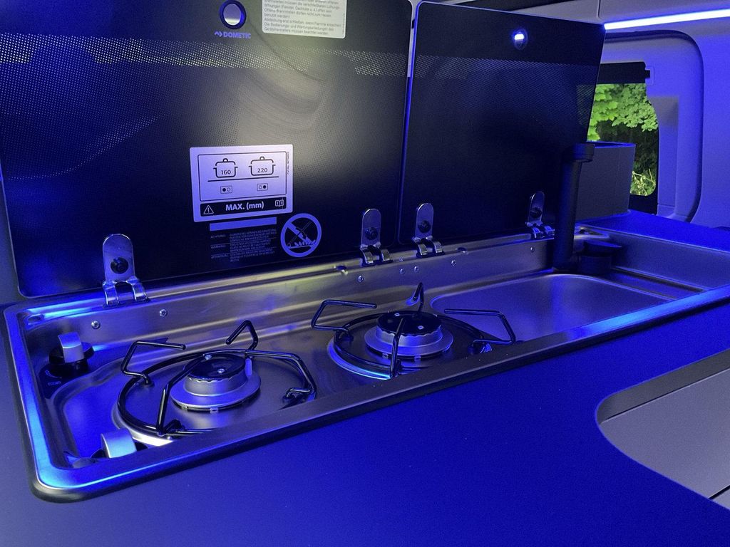 - 2 Flammen-Kochfeld mit entnehmbarem Topfgestell und integrierter Spüle (Warm- und Kaltwasser Funktion)