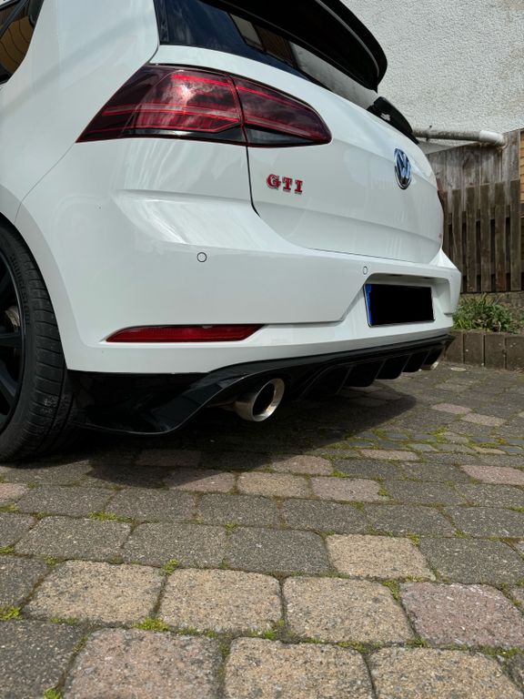 Es sind Eibach Tieferlegungsfedern verbaut. Diese verleihen dem Fahrzeug eine zum GTI deutlich passendere Optik. Im Verbindung mit dem werkseitig verbauten elektronisch-härteverstellbaren Fahrwerk DCC lässt sich der Wagen ebenso komfortabel bewegen. Weiterhin ist der Diffusor und die Frontlippe vom GTI TCR verbaut worden. Das ganze wird durch einen dezenten Maxton V.1 Heckspoiler abgerundet. Für einen besseren Klang wurde eine APR Abgasanlage eingebaut. Passende zu dem Wabenmuster der Sitze wurden die Klavierlack Elemente im Innenraum foliert.