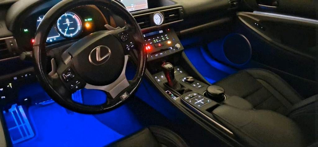 Zusätzlich zur Vollaustattung: LED Fussraumbeleuchtung sowie Einstiegsleisten Beleuchtung mit Lexus Schriftzug.