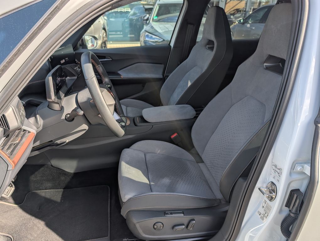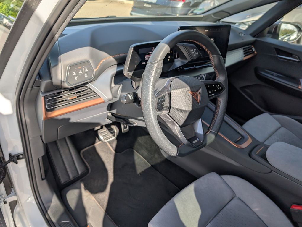 5 Lautsprecher, Airbag Beifahrerseite abschaltbar, Airbag Fahrer-/Beifahrerseite, Akustischer Fußgängerschutz, Außensound (e-sound / AVAS), Ambiente-Beleuchtung LED, Antriebs-Schlupfregelung (ASR), Audio-Navigationssystem mit Touchscreen Farbbildschirm, Außenspiegel elektr. verstell-, heiz- und anklappbar mit Spiegelabsenkung und Welcome Light, Blinkleuchten LED in Außenspiegel integriert, Bluetooth-Schnittstelle mit Freisprecheinrichtung integriert, Dachhimmel schwarz, Dinamica-Paket, grau, Einparkhilfe vorn und hinten, Elektromotor 150 kW (cont. 70 kW), Fahrassistenz-System: Fahrprofilauswahl (CUPRA Drive Profile), Fensterheber elektrisch vorn + hinten mit Komfortschaltung, Fußraumbeleuchtung LED, Heckleuchten Voll-LED mit Lichtband (Infinite Light), Heckspoiler Wagenfarbe (Dachspoiler), HV-Batterie 62 kWh brutto / 58 kWh netto, Innenspiegel mit Abblendautomatik, Isofix-Aufnahmen für Kindersitz an Beifahrersitz und Rücksitz (inkl. i-Size-Kindersitze), Karosserie: 5-türig, Klimaanlage Climatronic 2-Zonen, Kombiinstrument digital (virtual cockpit), Kopf-Airbag-System, Ladekabel mit Typ 2-Stecker (Mode 3), LM-Felgen, Notrufsystem, Parkbremse elektrisch, Pedale Aluminium-Design, Rückfahrkamera, Rücksitzlehne geteilt/klappbar (1/3-2/3), Schnellladevorrichtung (CCS-Ladedose), Schriftzug auf der Heckklappe, Seitenairbag, Seitenairbag vorn mitte (Central Airbag), Sitz vorn links höhenverstellbar, Sonnenblende links mit Spiegel (beleuchtet), Sonnenblende rechts mit Spiegel (beleuchtet), Sport-Schalensitze vorn mit integrierten Kopfstützen, USB-Ladeanschlüsse (2-fach, Typ C) für 2.Sitzreihe, Warnanlage für Sicherheitsgurt-System, Wärmeschutzverglasung