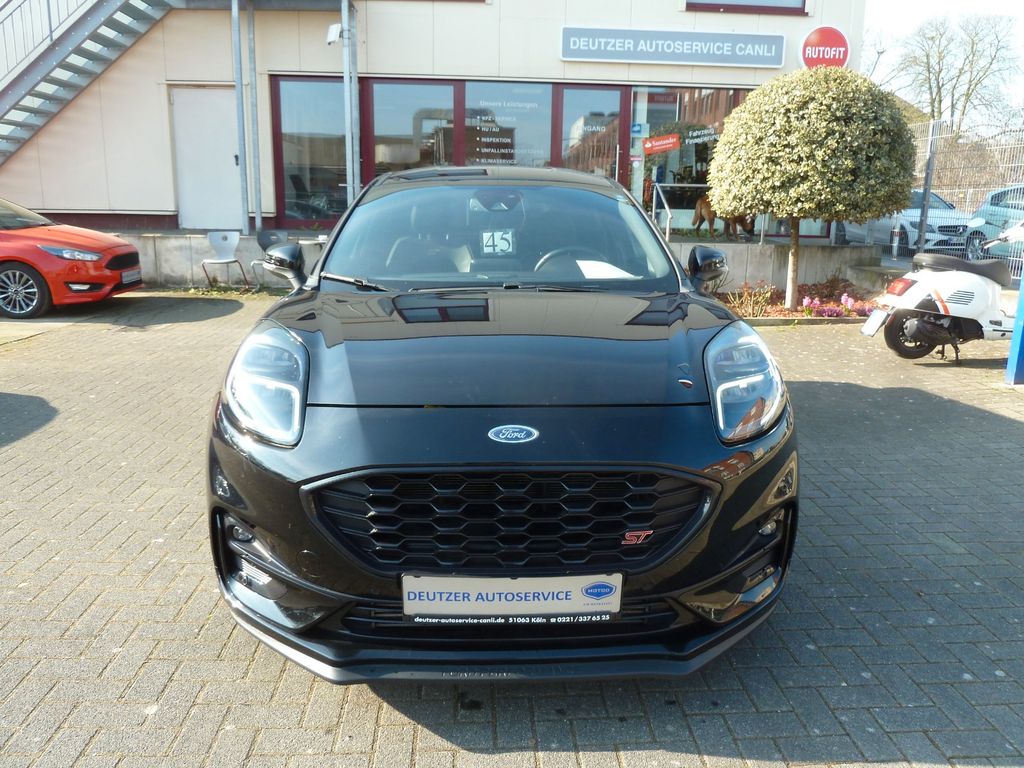 Ambiente-Beleuchtung vorn (LED), Antischlupfregelung (ASR), Audio-Navigationssystem Ford mit AppLink, Außenspiegel elektr. anklappbar, Außenspiegel elektr. verstell- und heizbar, Bi-LED-Scheinwerfer, Body-Styling-Paket, Bremssättel Rot lackiert, Dach andersfarbig lackiert / Kontrastfarbe, Dachhimmel Stoff, dunkel, Dachspoiler (große Ausführung) schwarz lackiert, Doppelendrohr Auspuffanlage, Eco-Anzeige für verbrauchsoptimiertes Fahren (EcoCoach), Einparkhilfe hinten, Fahrassistenz-System: Berganfahr-Assistent (Hill-Holder), Fahrassistenz-System: Falschfahrer-Warnfunktion, Fahrassistenz-System: Fernlichtassistent (Scheinwerfer mit Abblendautomatik), Fahrassistenz-System: Notbrems-Assistent, Fahrassistenz-System: Post-Collision-System, Fahrassistenz-System: Pre-Collision-System, Fahrassistenz-System: Spurhalteassistent mit Müdigkeitserkennungs-Sensor, Fahrassistenz-System: Verkehrsschildassistent, Farbdisplay für Bordcomputer, Fensterheber elektrisch vorn + hinten mit Komfortschließung, FordPass Connect inkl. eCall, Fußmatten ST-Design, Heckleuchten LED, Induktionsladeschale für mobile Endgeräte, Innenraumfilter: Staub- und Pollenfilter, Innenspiegel mit Abblendautomatik, Intelligent Protection System (IPS), Intelligenter Geschwindigkeits-Begrenzer, Isofix-Aufnahmen für Kindersitz, Karosserie: 5-türig, Klimaautomatik 2-Zonen, Kombiinstrument Digitalanzeige 12,3 Zoll, Kopfstützen hinten mechan. verstellbar (3 Stück), Laderaumboden variabel (Ford Megabox), Lendenwirbelstütze vorn, Lenkrad (Sport/Leder, ST), Lenkrad heizbar, Lenksäule (Lenkrad) höhen-/längsverstellbar, LM-Felgen, Motor 1,5 Ltr. - 147 kW EcoBoost KAT, My Key (2. Fahrzeugschlüssel programmierbar), Nebelscheinwerfer LED, Otto-Partikelfilter (OPF), Parkpilotsystem vorn, Pedale Aluminium, Radstand 2588 mm, Reifen-Reparaturkit, Reifendruck-Kontrollsystem, Rücksitzlehne geteilt/klappbar (60:40), Schadstoffarm nach Abgasnorm Euro 6d, Scheinwerfer-Assistent mit Tag-/Nachtsensor, Sitze vorn höhenverstellbar, Sitzheizung vorn, Sonnenblende links mit Spiegel (beleuchtet), Sonnenblende rechts mit Spiegel (beleuchtet), Sport-Fahrwerk, Sportsitze vorn (Recaro) Teilleder Dinamica, Standard Variante, Start/Stop-Anlage, Türgriffe außen Wagenfarbe, Verglasung hinten abgedunkelt (Privacy Glass)
