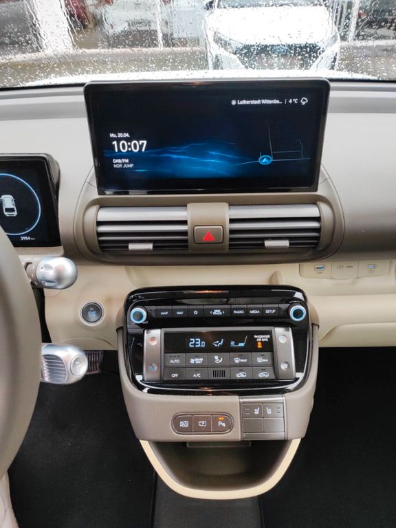 Dieser gebrauchte Hyundai INSTER bietet als elektrisches Offroad-Fahrzeug eine perfekte Kombination aus Umweltfreundlichkeit und Geländetauglichkeit. Mit einer Leistung von 97 PS und Frontantrieb überzeugt er durch seine kompakten Abmessungen von 3825 mm Länge, 1610 mm Breite und 1575 mm Höhe. Das Fahrzeug aus dem Jahr 2025 hatte bisher nur einen Vorbesitzer und verfügt über ein vollständiges Serviceheft. Die Ladezeiten sind mit 30 Minuten für Schnellladung und 240 Minuten für Normalladung praxistauglich. Besonders praktisch: Sowohl Typ-2 als auch CCS-Combo Anschlüsse sind vorhanden.Die Ausstattung umfasst moderne Sicherheitssysteme wie Spurhalteassistent, Kollisionsvermeidung und Totwinkelwarner. Der Innenraum in Schwarz mit Stoffbezügen bietet vier Sitzplätze, beheizbare Vordersitze und ein beheiztes Lenkrad. Das digitale Cockpit mit Touchscreen, Navigationssystem und kabelloser Ladestation für Smartphones rundet das Technologiepaket ab.