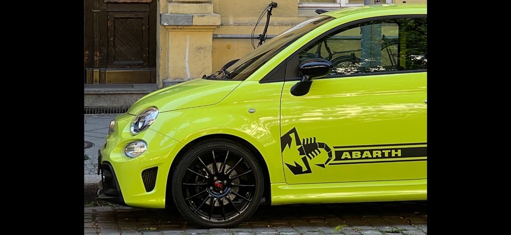 Abarth Estetico Kit in Schwarz mit Seitenstreifen, Skorpion, Bremsklötze schwarz.