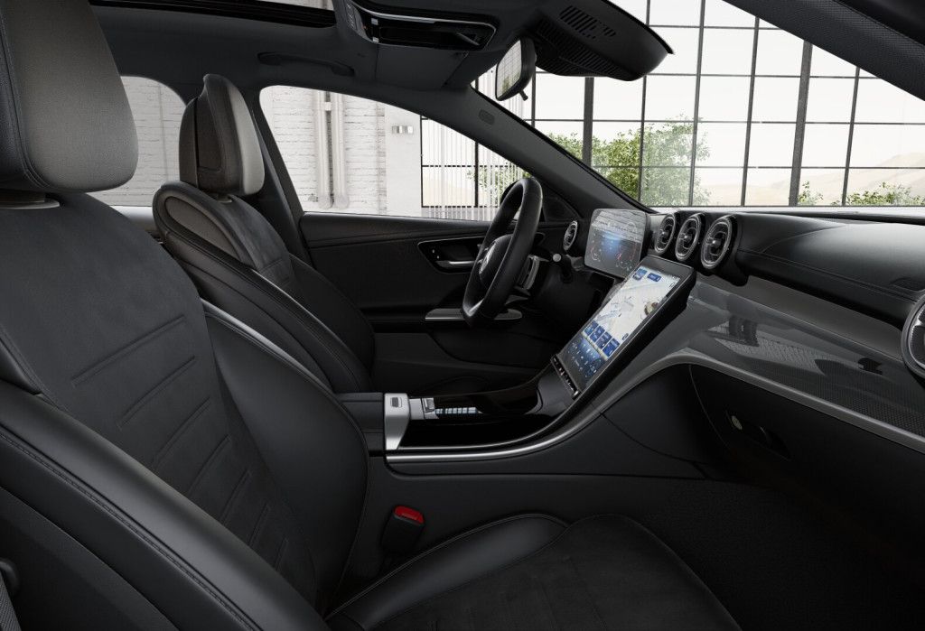 elektrisches Panoramadach, Lenkradheizung, virtuelle Instrumente, Lederlenkrad, Multifunktionslenkrad, Ambientebeleuchtung, Ambientes Licht, AMG Line Interieur, Dachhimmel schwarz, Getränkehalter, Handschuhfach verschließbar.