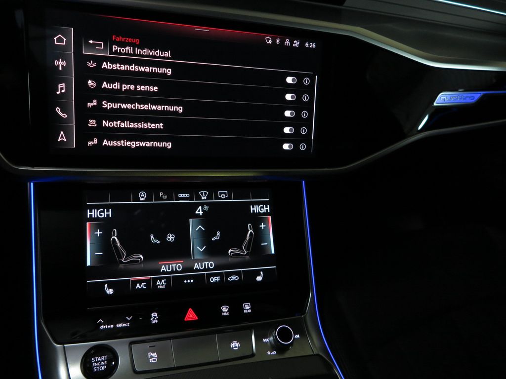 Ablage-Paket, Anhängerkupplung Vorbereitung, Audi Smartphone Interface, Bedienelemente Glasoptik, inkl. erweiterter Aluminium-Optik, Business-Paket, Dachhimmel Stoff, schwarz, Fahrassistenz-System: Spurwechselassistent (Side Assist) inkl. Audi pre sense rear, Harnstofftank (SCR): 24 Ltr., Head-up-Display, Isofix-Aufnahmen für Kindersitz an Beifahrersitz, Kombiinstrument digital (virtual cockpit plus), Komfortschlüssel mit sensorgesteuerter Heckklappenentriegelung inkl. (öffnen + schliessen), Kontur / Ambientebeleuchtungs-Paket (plus), Kopfstützen variabel verstellbar, Kraftstofftank: 73 Ltr., LM-Felgen 8,5x19 (10-Speichen, Dynamik-Design), Metallic-Lackierung, Panoramadach vorn elektrisch, hinten fest, Rückfahrkamera, Seitenairbag vorn und hinten, Sitzbezug / Polsterung: Leder Milano, Sitze vorn elektr. verstellbar (links mit Memory), Sound-System DSP / Audi Sound-System, Verglasung hinten abgedunkelt (Privacyverglasung) und Türscheiben vorn Akustikglas