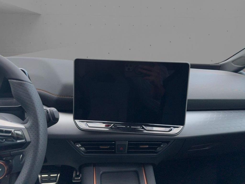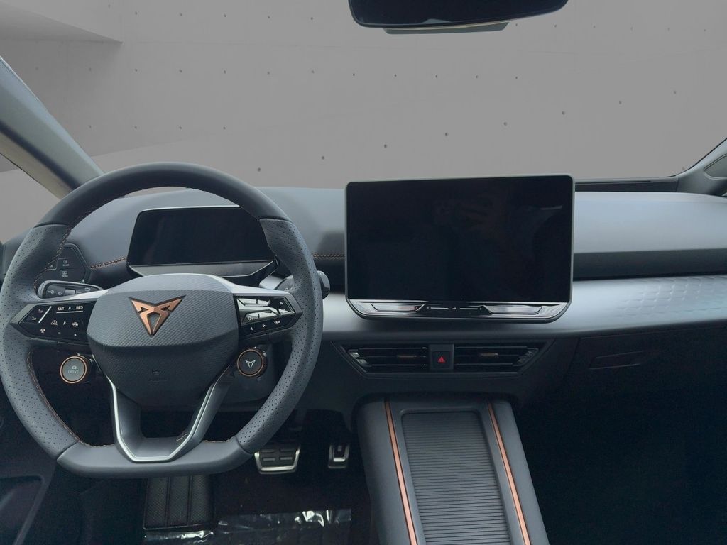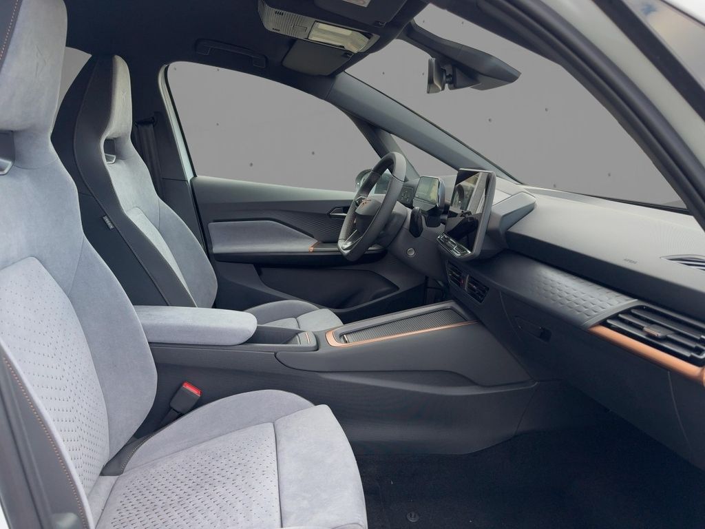 Technik + Sicherheit:Elektron. Stabilitätskontrolle (ESC); ASR; Kopf-Airbag-System; Airbag Beifahrerseite abschaltbar; Seitenairbag; Airbag Fahrer-/Beifahrerseite; Seitenairbag vorn mitte (Central Airbag); beheizte Scheibenwaschdüsen; Diebstahl-Warnanlage mit Innenraumüberwachung und Abschleppschutz; Innenspiegel mit Abblendautomatik; Außentemperatur-Anzeige; Servolenkung elektro-mechanisch; Parkbremse elektrisch; Progressivlenkung; Schnellladevorrichtung (CCS-Ladedose); Service-System: Intelligente Fahrzeugvernetzung (Car2X); Schließ-/Startsystem Kessy Advanced; Fahrprofilauswahl (CUPRA Drive Profile); Akustischer Fußgängerschutz, Außensound (e-sound / AVAS); Wegfahrsperre (elektronisch); Elektromotor 170 kW (cont. 70 kW)